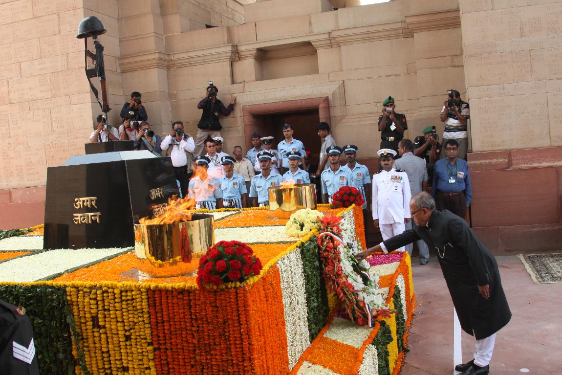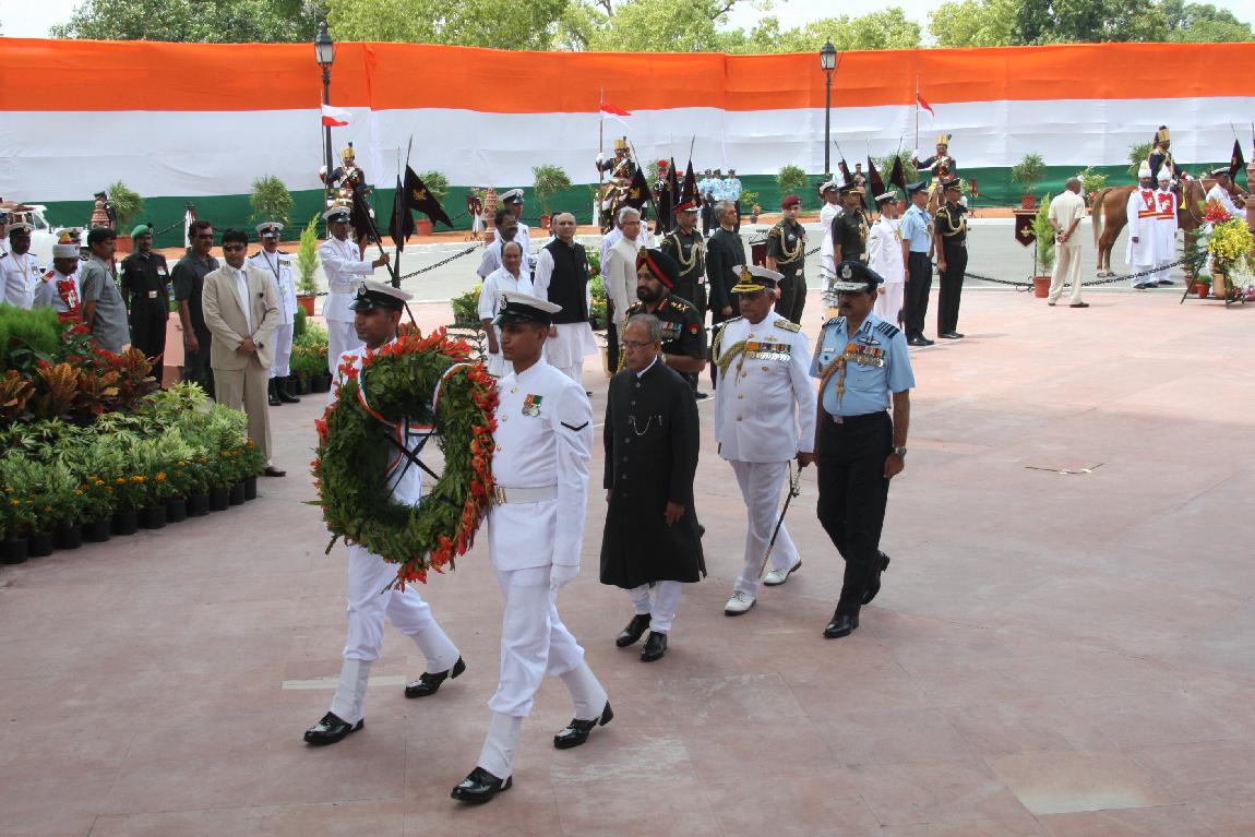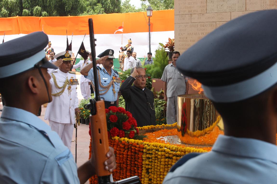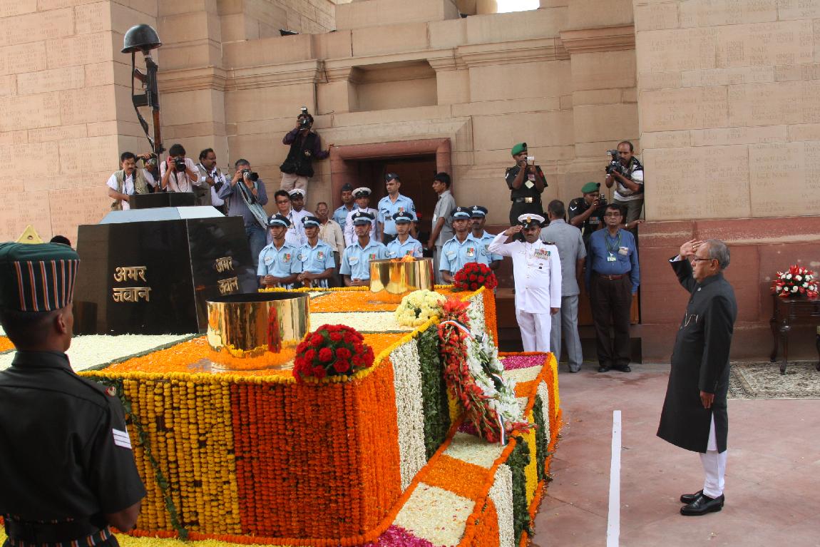 | Caption: | The President of India, Shri Pranab Mukherjee leaves North Court for India Gate to pay tributes at Amar Jawan Jyoti on August 15, 2012 |