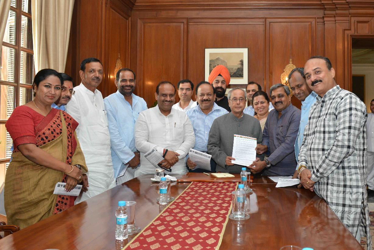 | Caption: | The President of India, Shri Pranab Mukherjee meeting with Shri Satish Upadhyay, President Bharatiya Janata Party, Delhi Pradesh and others, at Rashtrapati Bhavan, in New Delhi on August 10, 2015. |