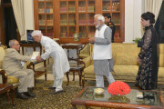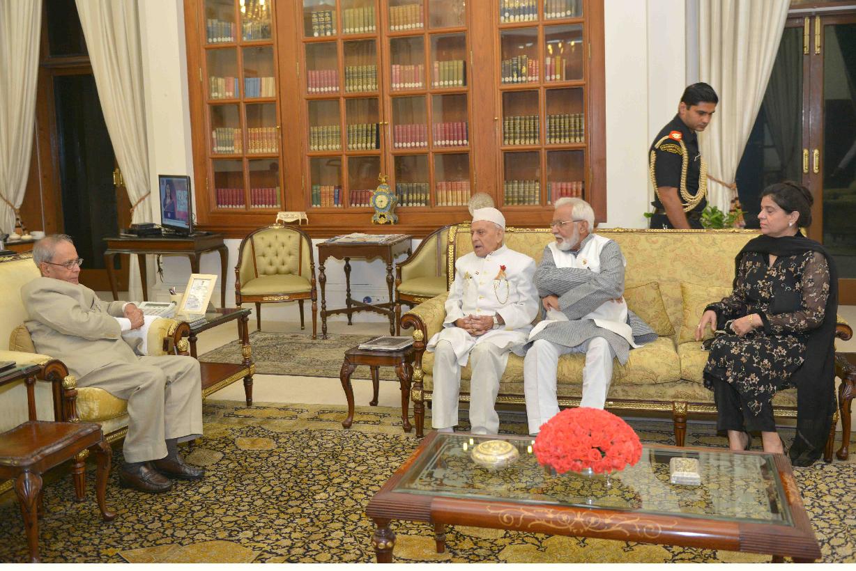 | Caption: | The President of India, Shri Pranab Mukherjee meeting with Dr. (Pt.) Anand Mohan Zutshi, President, Smt. Farrukh Naaz, Vice President & Shri Barul Islam from Anzuman Talim-e-Urdu, Delhi, at Rashtrapati Bhavan, in New Delhi on September 10, 2015. |