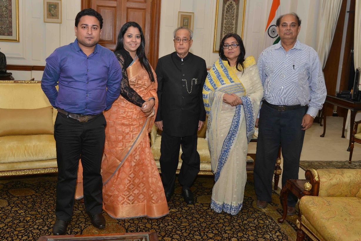 | Caption: | The President of India, Shri Pranab Mukherjee meeting with Shri Robin Mukherjee, Secretary, Agni Vina and others, at Rashtrapati Bhavan, in New Delhi on September 09, 2015. |