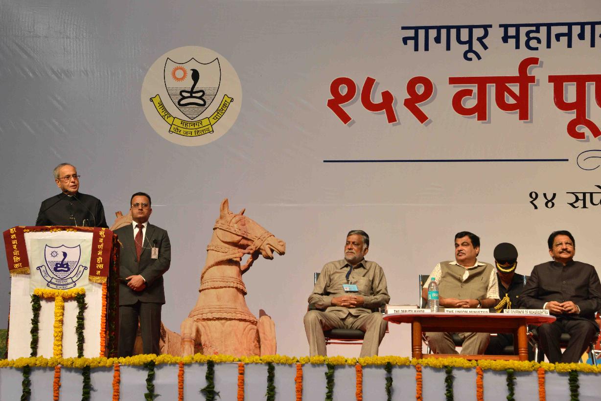 | Caption: | The President of India, Shri Pranab Mukherjee attending the 151st year celebrations of Nagpur Mahanagarpalika, at Nagpur, in Maharashtra on September 14, 2015. The Governor of Maharashtra, Shri C. Vidyasagar Rao, the Union Minister for Road Transport & Highways and Shipping, Shri Nitin Gadkari and the Chief Minister of Maharashtra, Shri Devendra Fadnavis are also seen. |