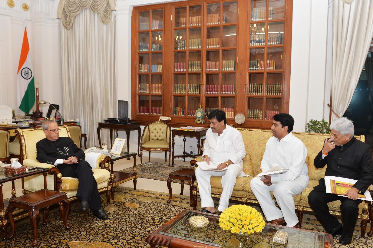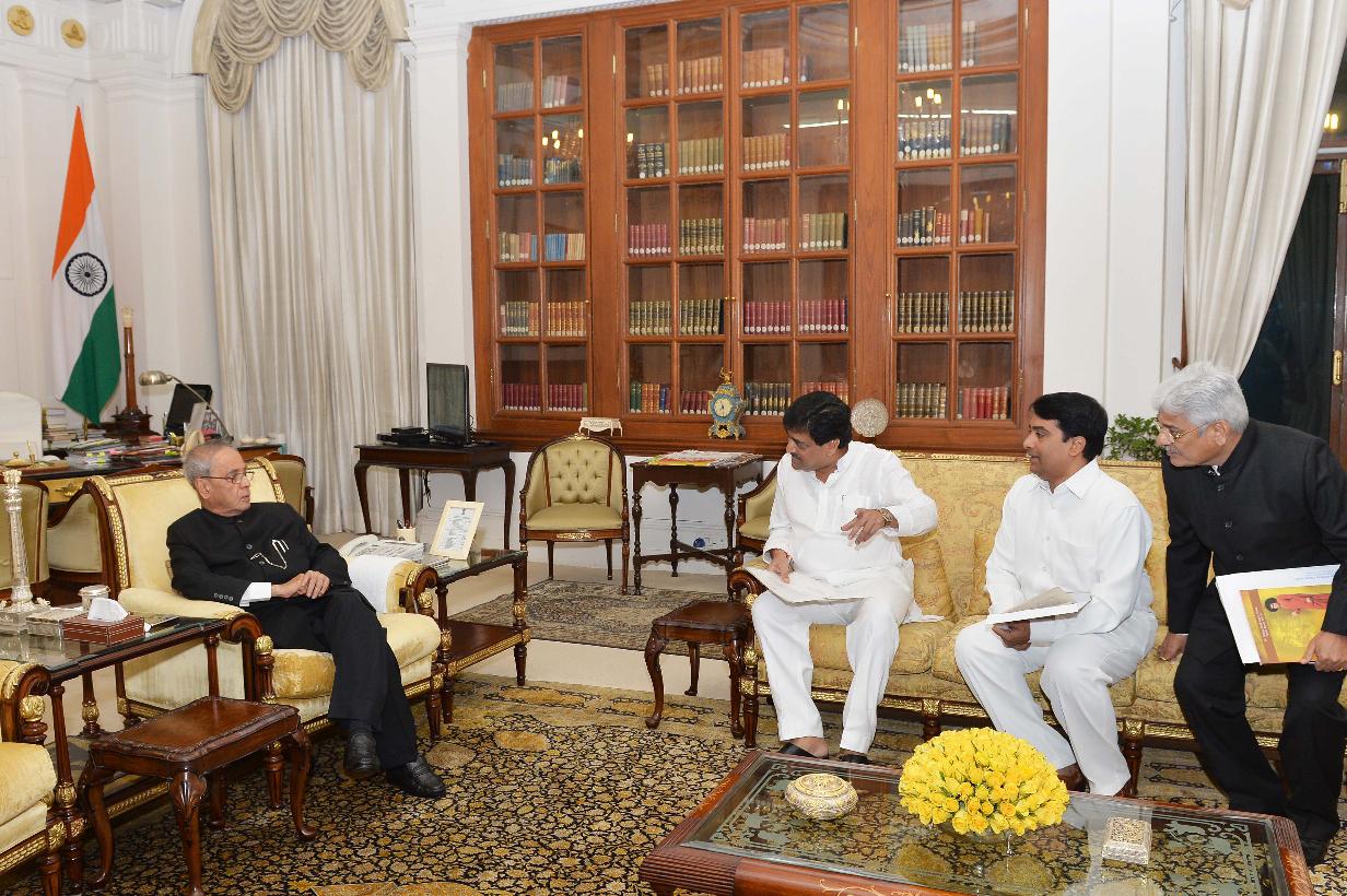| Caption: | The President of India, Shri Pranab Mukherjee meeting with the former Chief Minister of Maharashtra, Shri Ashok Chavan alongwith Shri Ratnakar, at Rashtrapati Bhavan, in New Delhi on September 16, 2015. |