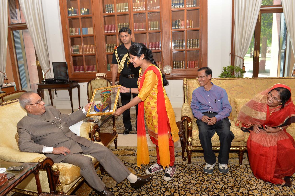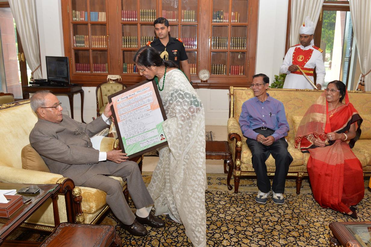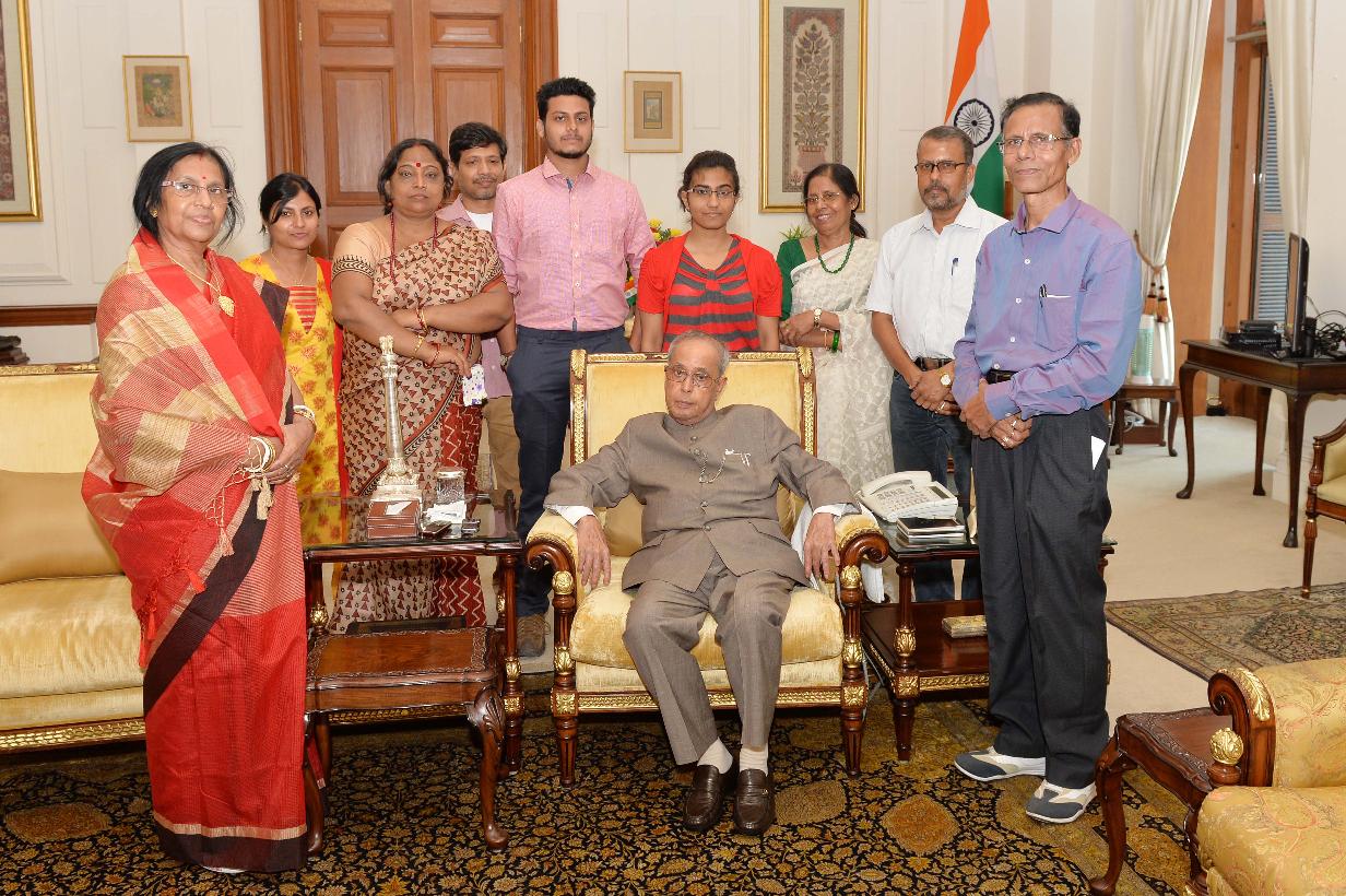 | Caption: | The President of India, Shri Pranab Mukherjee meeting with Shri Dilip Kumar Ghosh and family members, at Rashtrapati Bhavan, in New Delhi on September 29, 2015. |