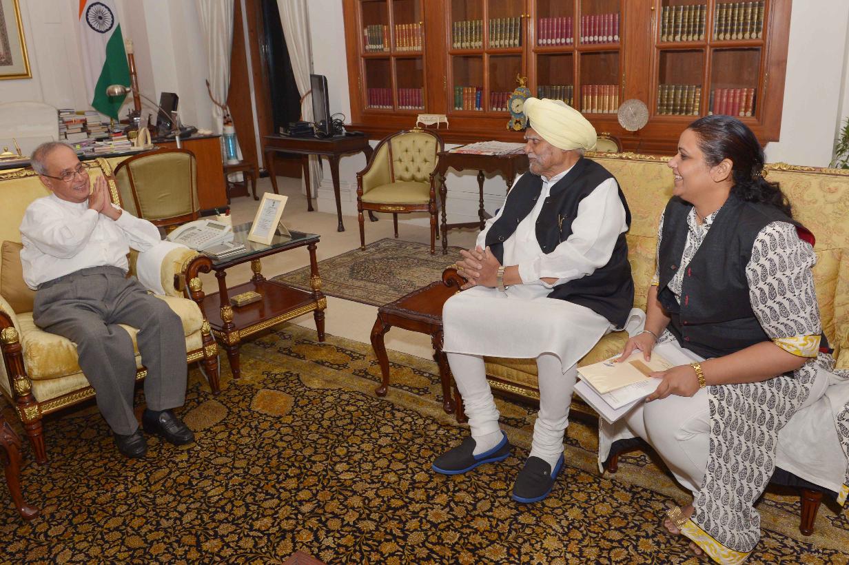 | Caption: | The President of India, Shri Pranab Mukherjee meeting with Sardar Buta Singh, former Union Minister alongwith his daughter Ms. Gurkeerat Kaur, at Rashtrapati Bhavan, in New Delhi on October 07, 2015. |