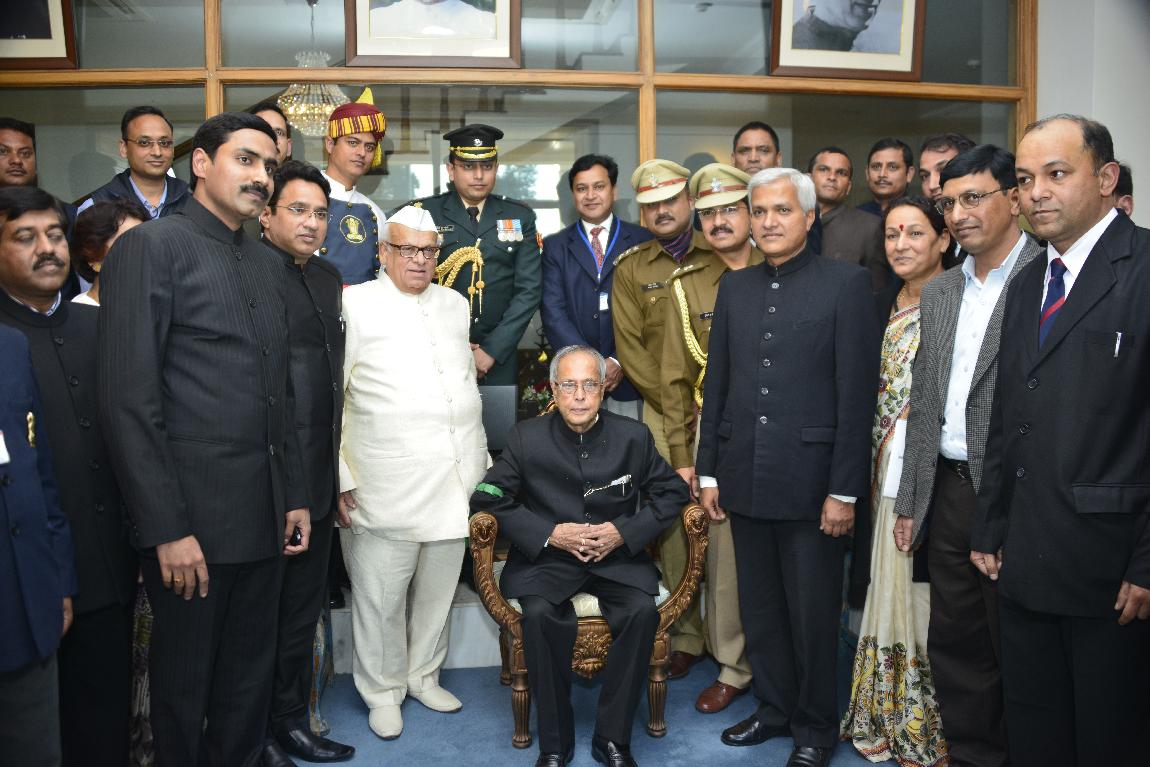 | Caption: | The President of India, Shri Pranab Mukherjee Posing for a Group Photograph with Officers at Raj Bhavan on Dec 09, 2012 |