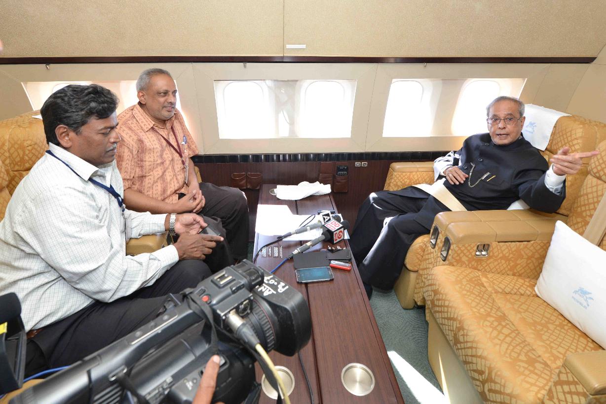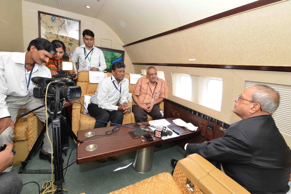 | Caption: | The President of India, Shri Pranab Mukherjee interacting with the media persons on board aircraft on his way back to New Delhi from Karnataka on July 28, 2015. |