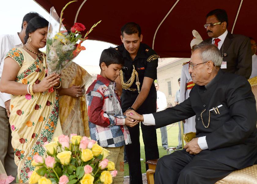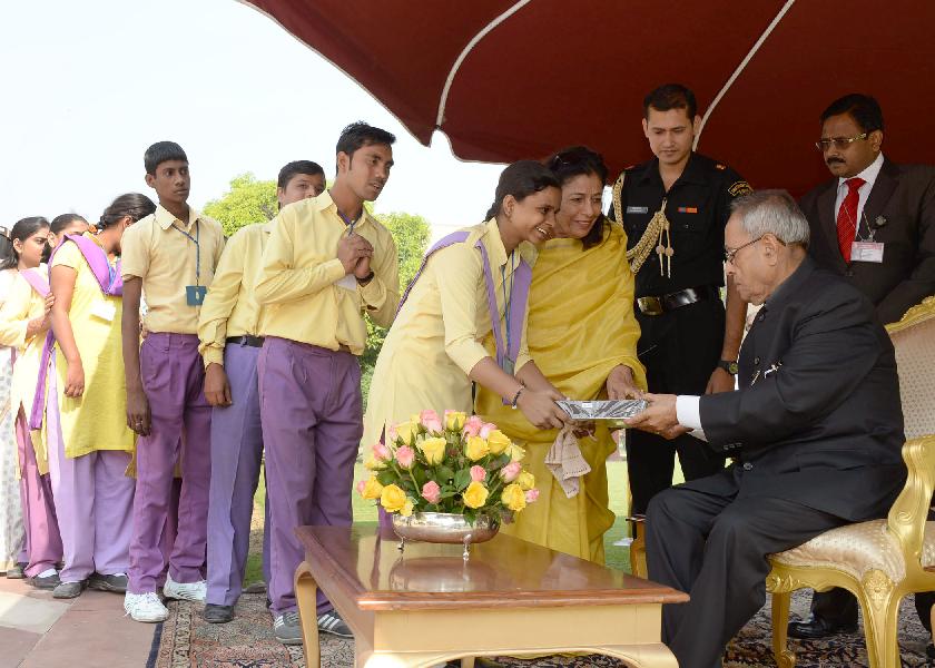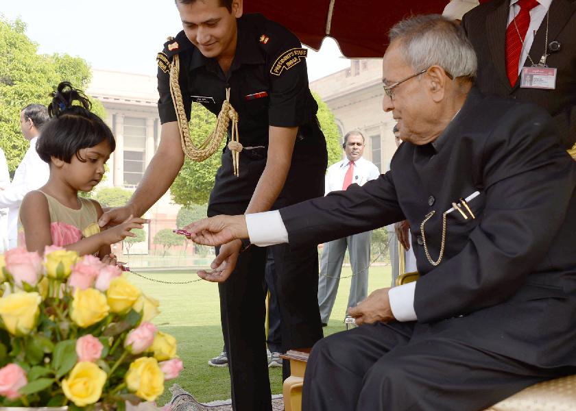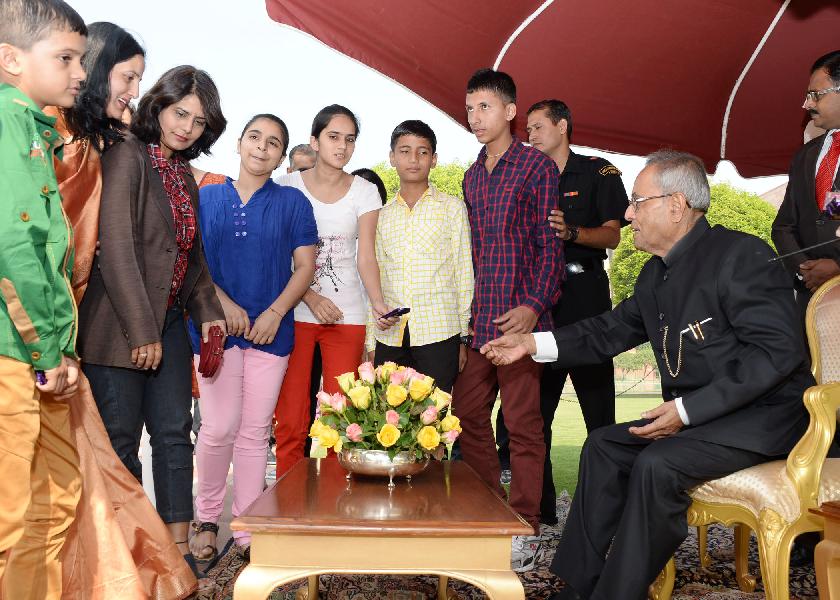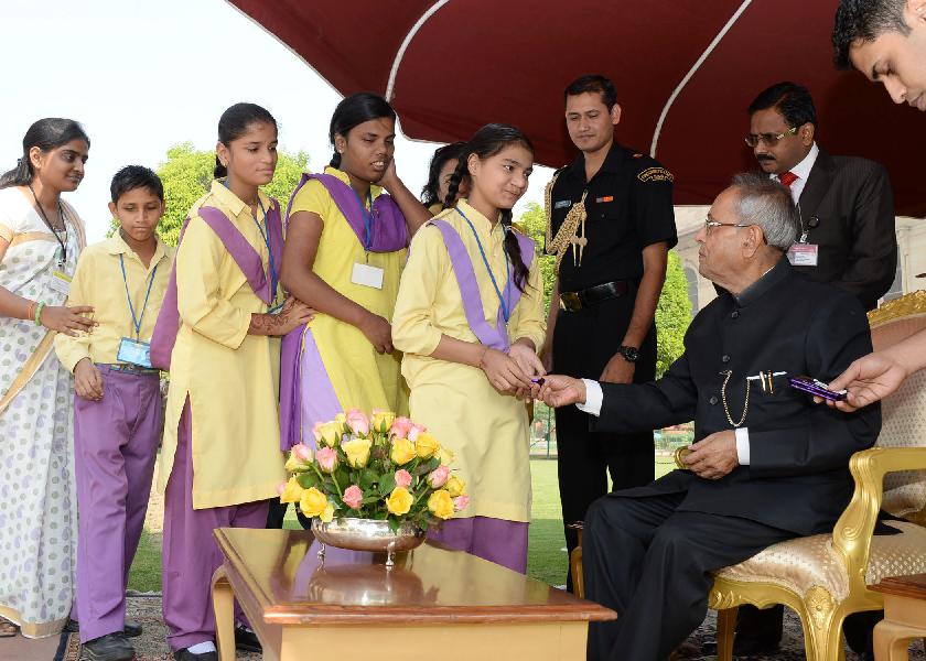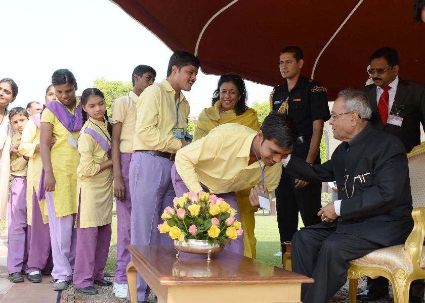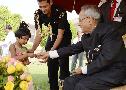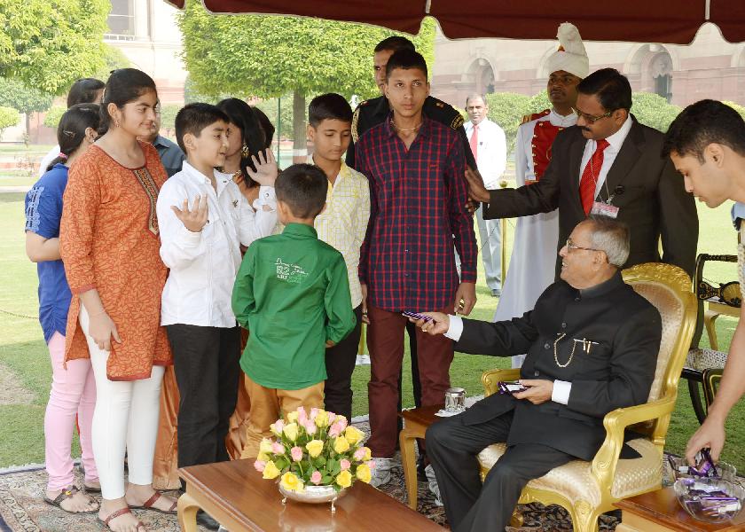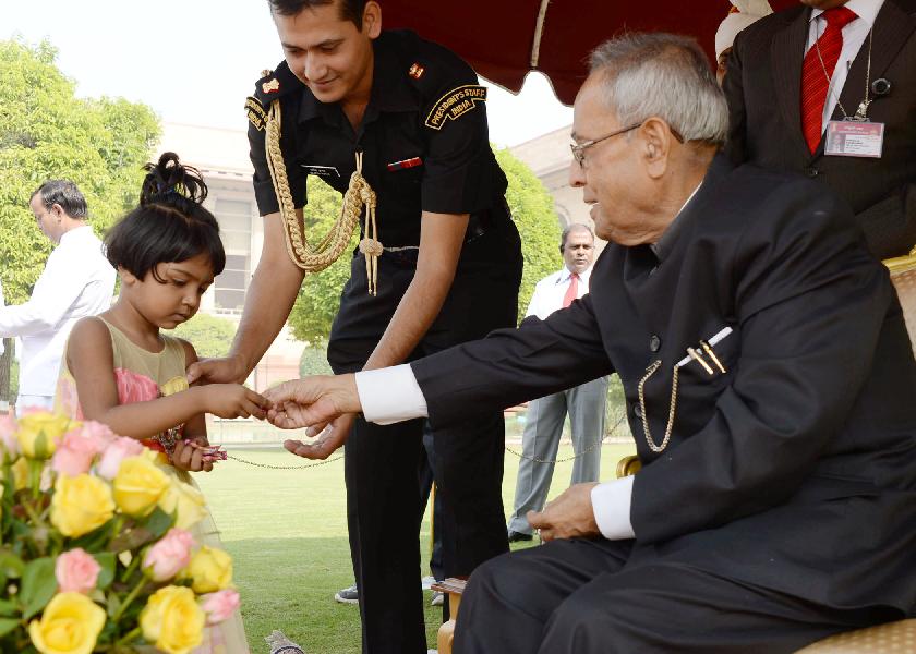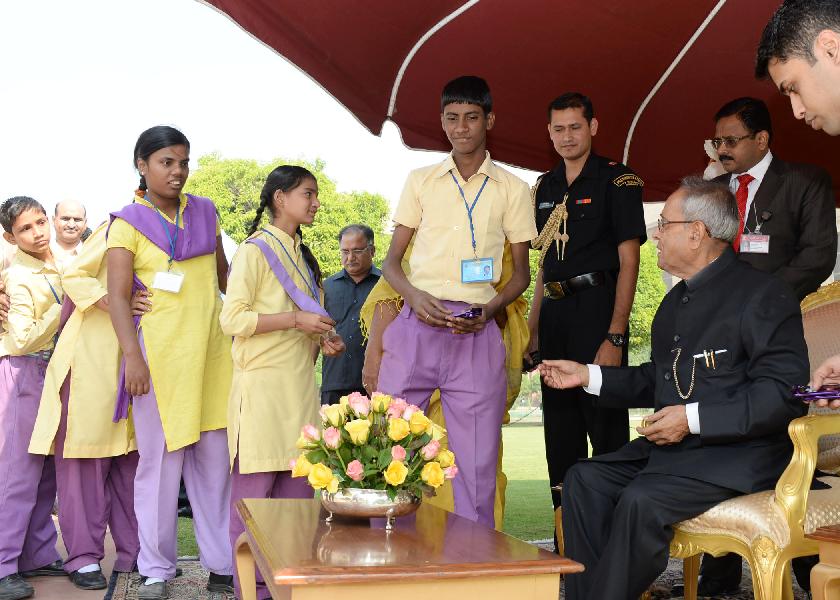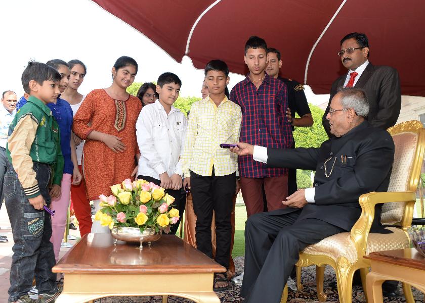| Caption: | The President of India, Shri Pranab Mukherjee receiving greetings from various school students and all walks of life on the occasion of Diwali at Rashtrapati Bhavan in New Delhi on Nov 03, 2013 |