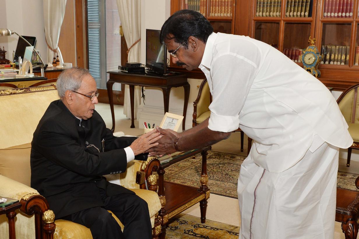 | Caption: | The President of India, Shri Pranab Mukherjee meeting with the former Union Minister of State for Finance, Shri SS Palanimanickam, at Rashtrapati Bhavan, in New Delhi on August 26, 2015. |