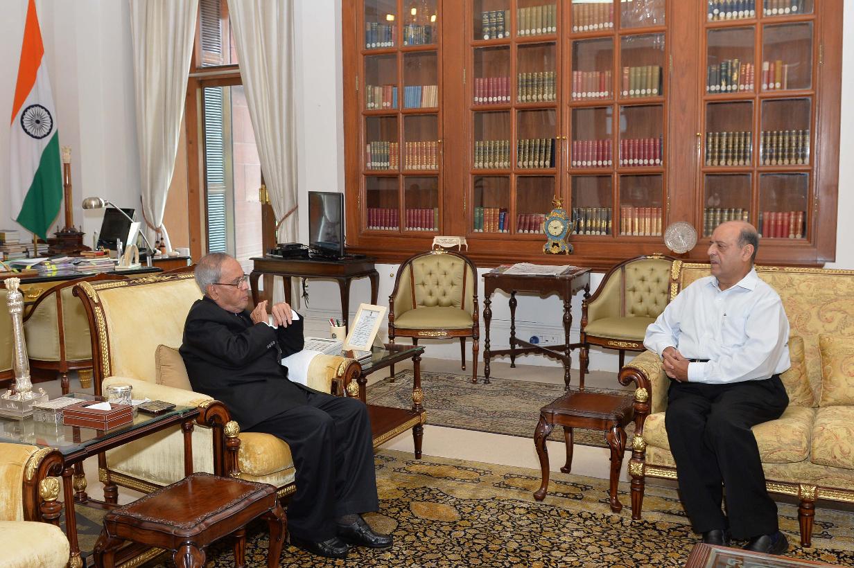 | Caption: | The President of India, Shri Pranab Mukherjee meeting with the former Chief Election Commissioner of India, Shri Navin Chawla, at Rashtrapati Bhavan, in New Delhi on August 26, 2015. |