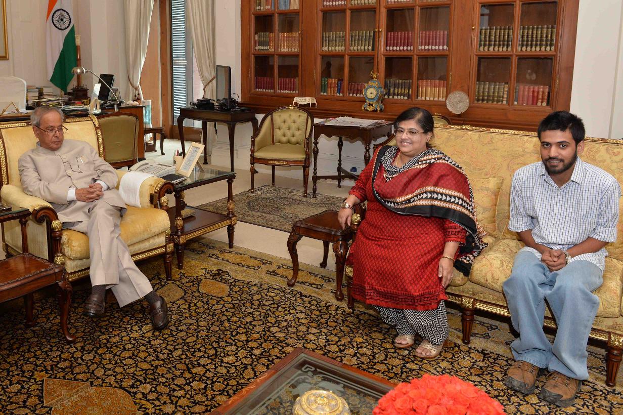 | Caption: | The President of India, Shri Pranab Mukherjee meeting with Dr. Devolina Sikdar alongwith her son Shri Sushmit Sikdar, at Rashtrapati Bhavan, in New Delhi on August 22, 2015. |
