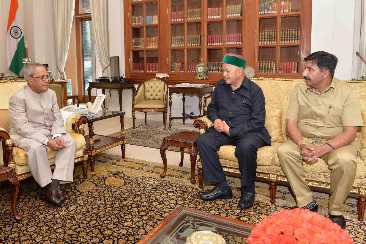 | Caption: | The President of India, Shri Pranab Mukherjee meeting with Shri Virbhadra Singh, Chief Minister, Himachal Pradesh and Shri Mukesh Agnihori, Industry Minister, Himachal Pradesh, at Rashtrapati Bhavan, in New Delhi on August 22, 2015. |