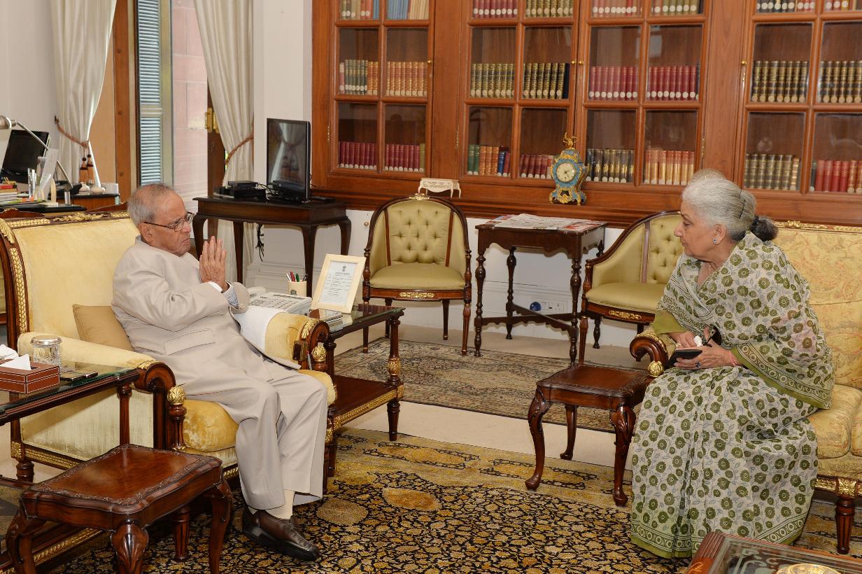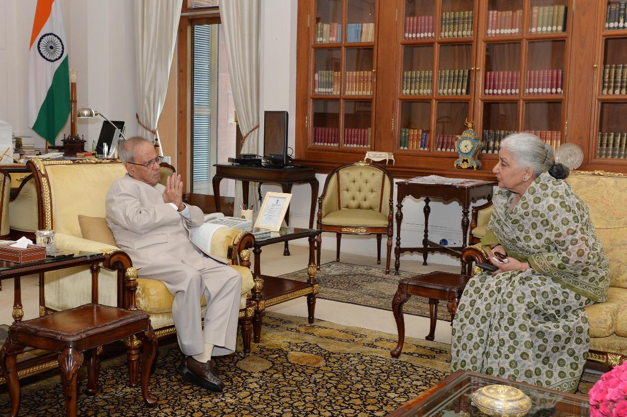 | Caption: | The President of India, Shri Pranab Mukherjee meeting with the former Union Minister, Smt. Chandresh Kumari Katoch, at Rashtrapati Bhavan, in New Delhi on August 31, 2015. |