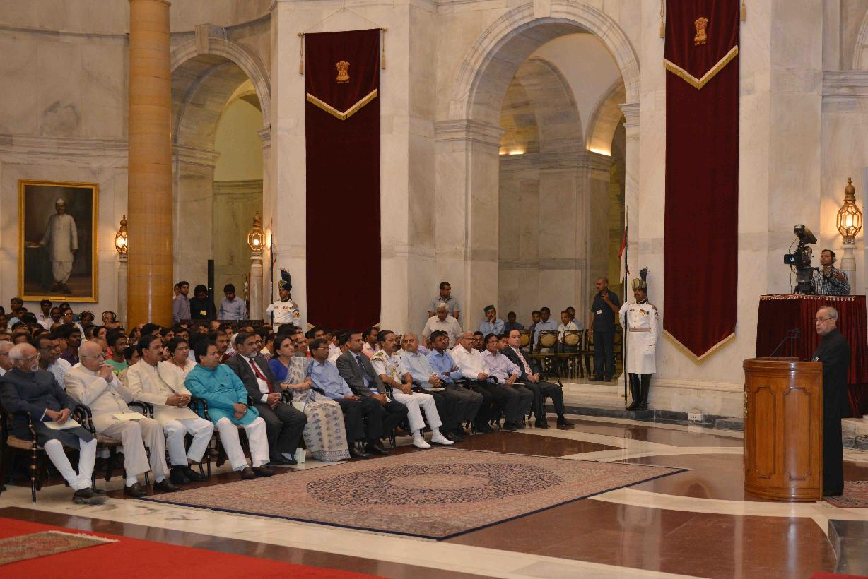 | Caption: | The President of India, Shri Pranab Mukherjee presenting the Gandhi Peace Prize for the year 2014 to Indian Space Research Organization (ISRO), received by the Chairman, ISRO, Shri A.S. Kiran Kumar, at Rashtrapati Bhavan on September 09, 2015. |