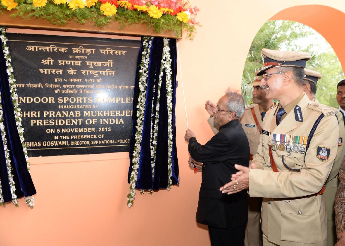 | Caption: | The President of India, Shri Pranab Mukherjee inaugurating the Indoor Sports Complex during Dikshant Parade of the Indian Police Service Probationers of 2012 Batch at Sardar Vallabhbhai Patel National Police Academy at Hyderabad in Andhra Pradesh on Nov 05, 2013 |