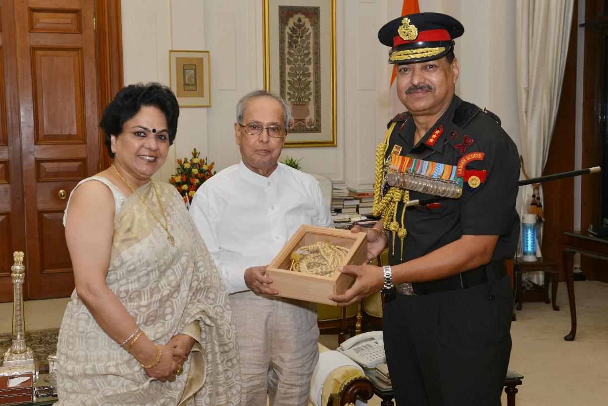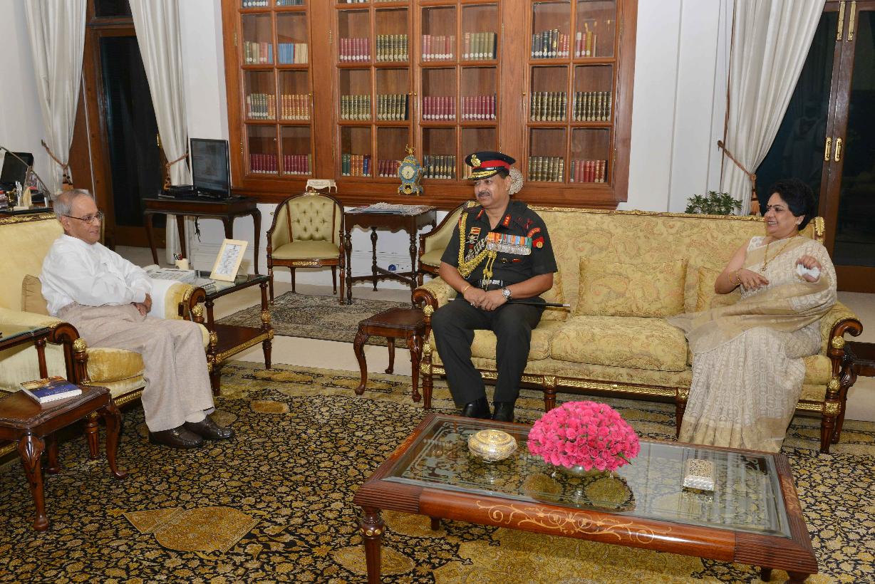 | Caption: | The President of India, Shri Pranab Mukherjee meeting with Lt. Gen. Sandeep Singh, Director General, Rashtriya Rifles & Hony ADC to the President and Smt. Yashmi Singh, at Rashtrapati Bhavan, in New Delhi on September 21, 2015. |
