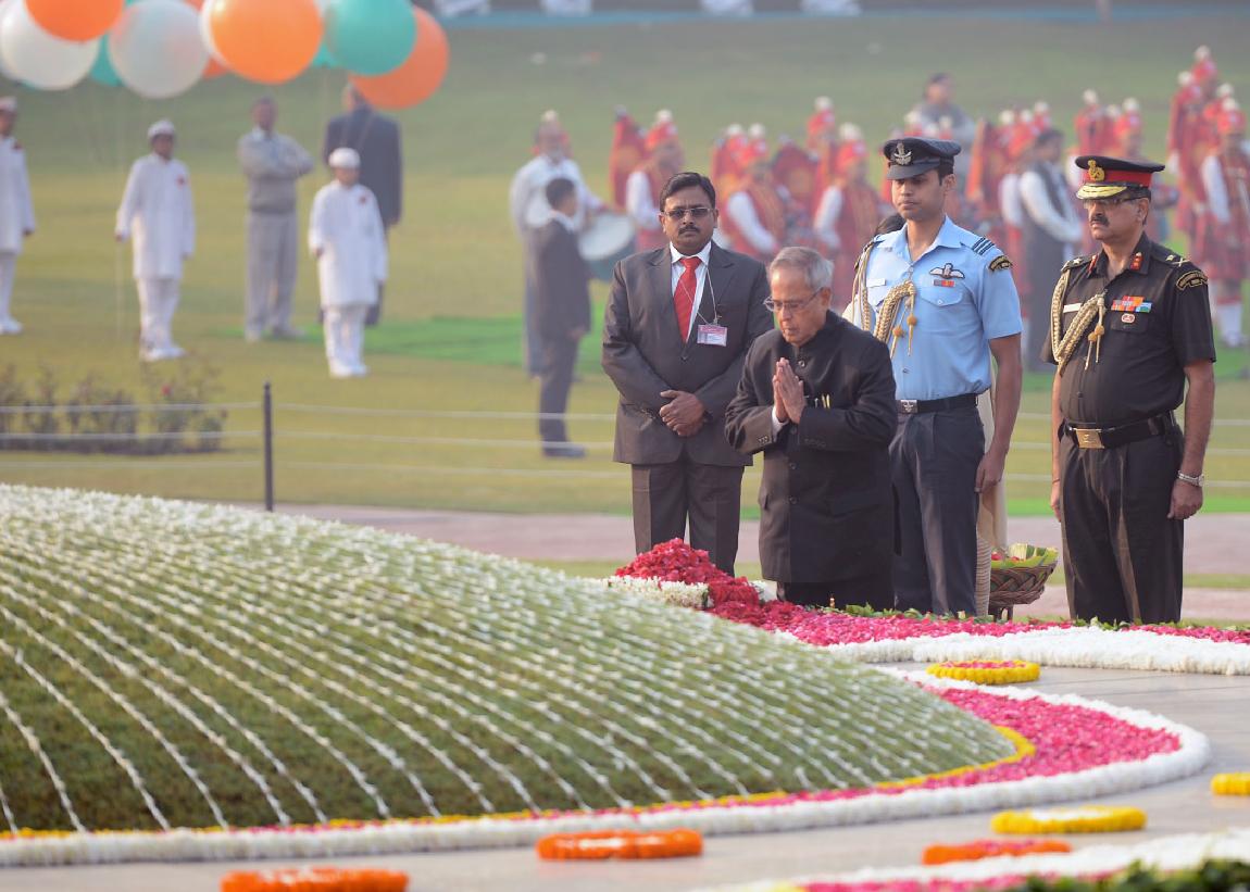 | Caption: | The President of India, Shri Pranab Mukherjee paying his floral tributes at the Samadhi of the Former Prime Minister of India, Late Pandit Jawaharlal Nehru at Shanti Van in New Delhi on Nov 14, 2013 |