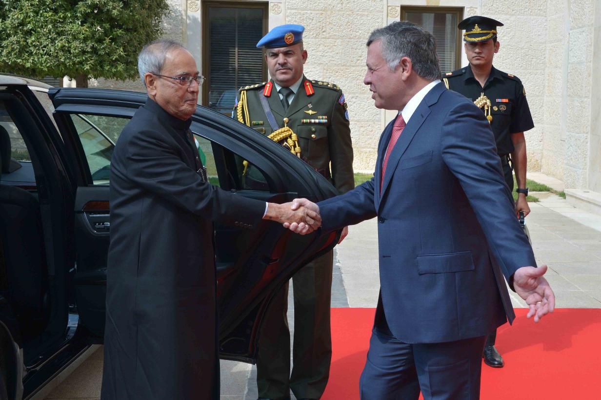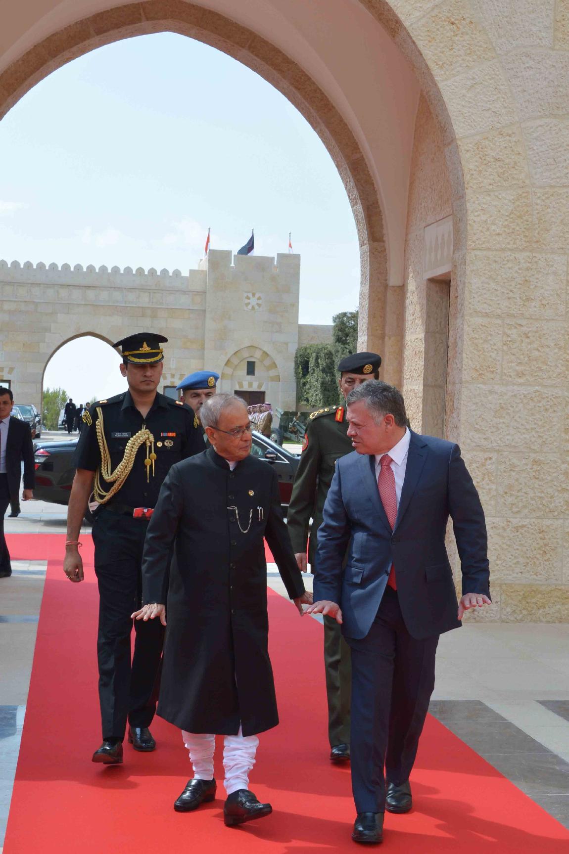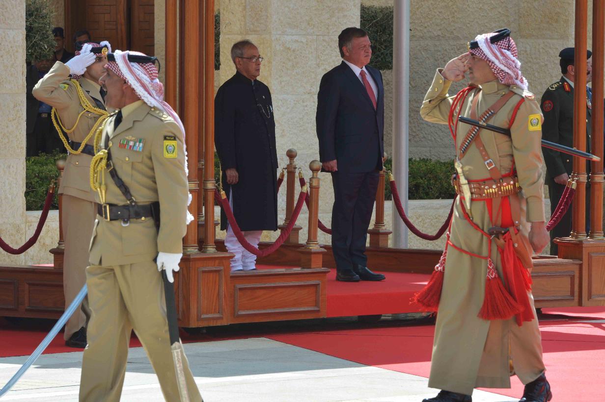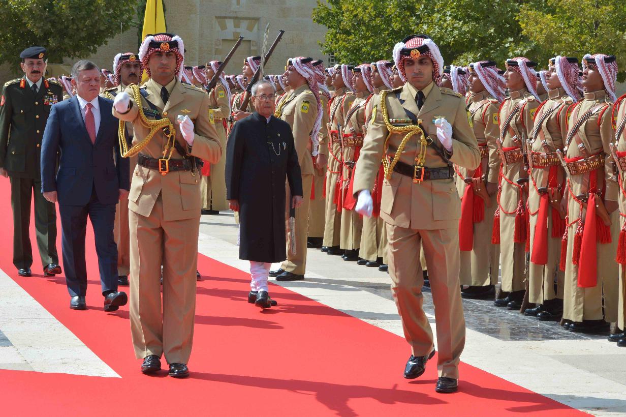 | Caption: | The President of India, Shri Pranab Mukherjee inspecting the Guard of Honour at the Ceremonial Reception in Al Husseinieh Palace at Amman in Jordan on October 10, 2015. The President being received by HM King Abdullah of Jordan at Al Husseinieh Palace. |