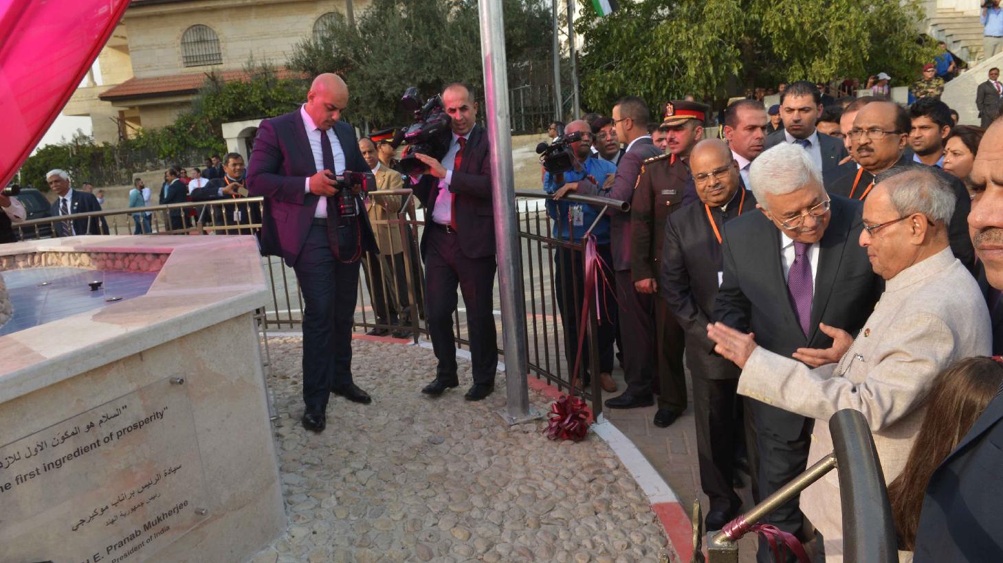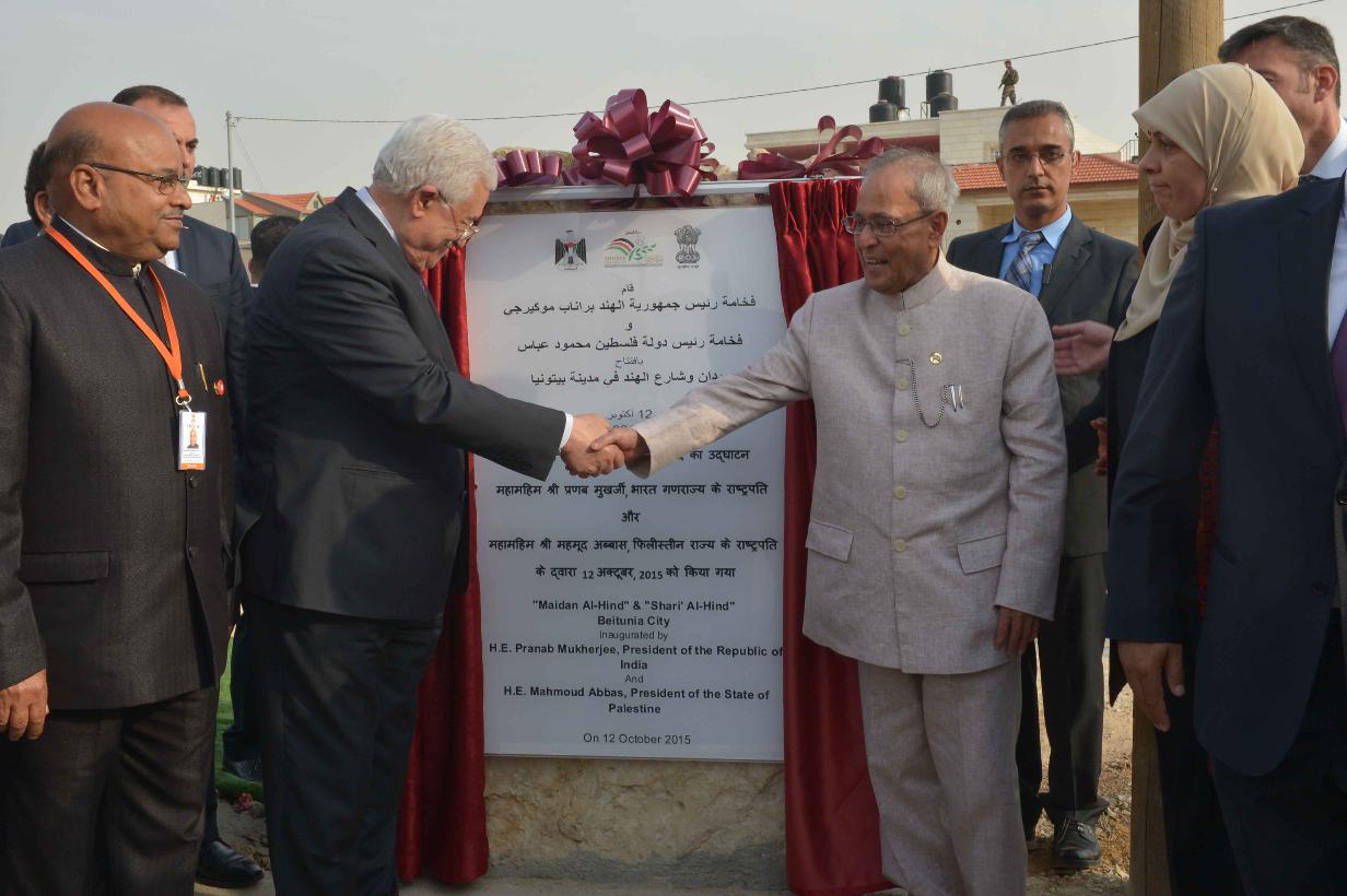 | Caption: | The President of India, Shri Pranab Mukherjee and the President of Palestine, Mr. Mahmoud Abbas during Road Naming Ceremony (Sharia-al-Hind) and Inauguration of a roundabout (Midan-al-Hind) at Beitunia, Ramallah in Palestine on October 12, 2015. |