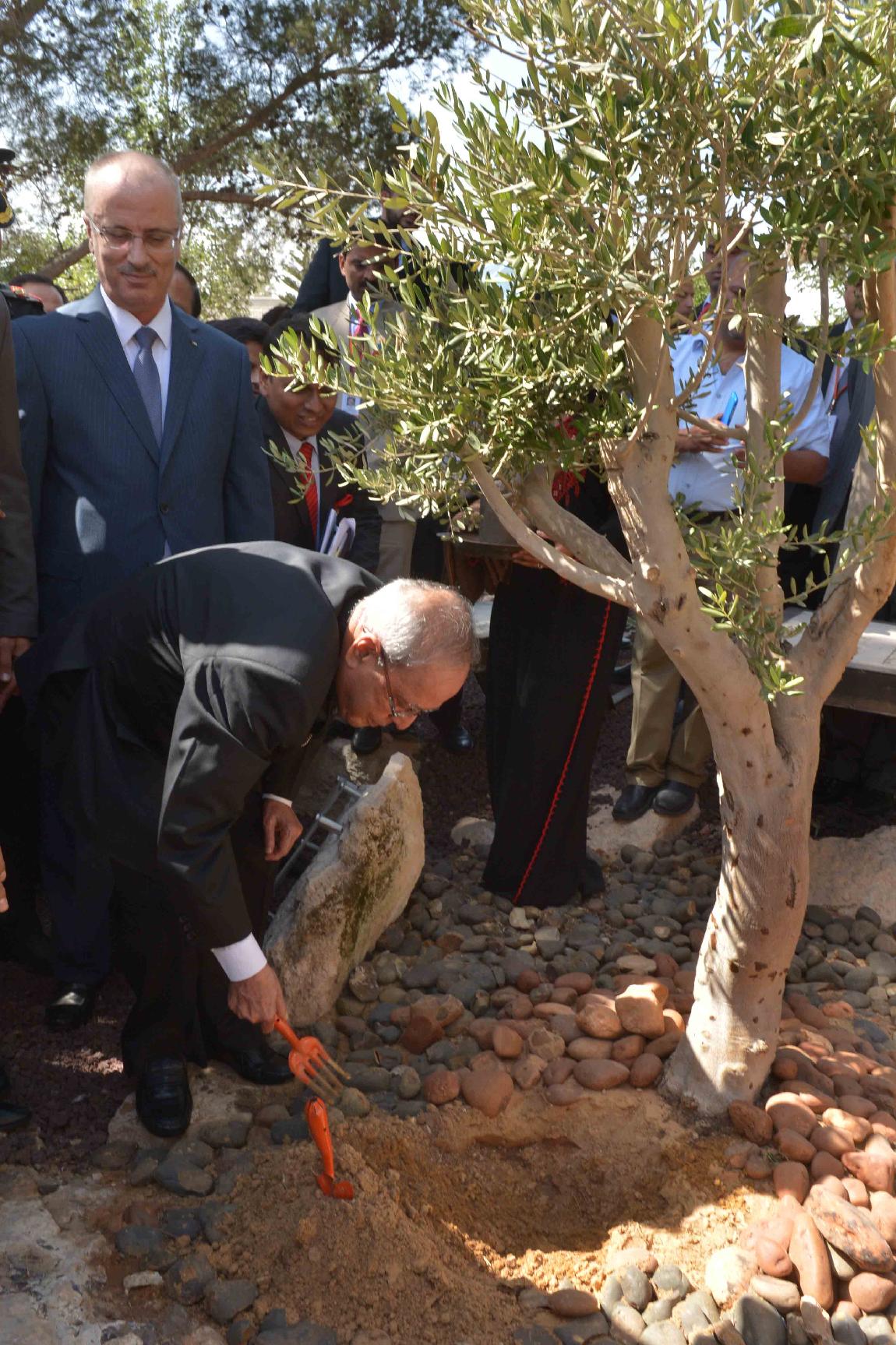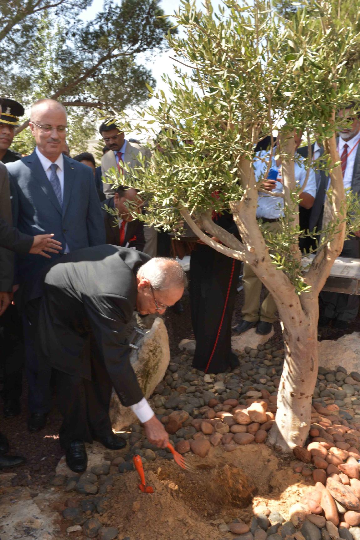 | Caption: | The President of India, Shri Pranab Mukherjee planting an Olive sapling, at Al-Quds University, Abu Dees, in Palestine on October 13, 2015. |