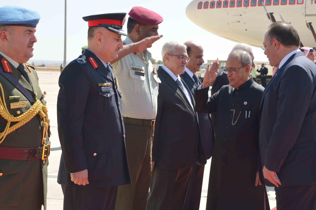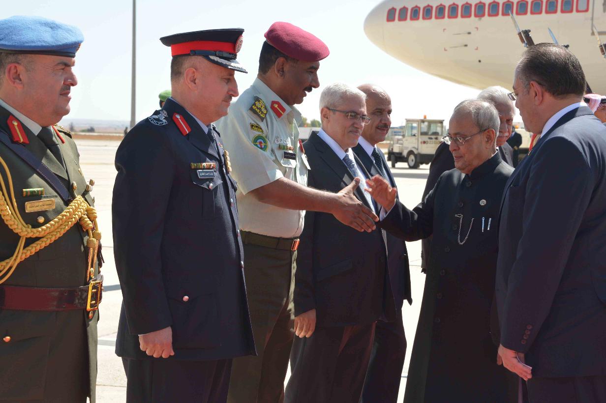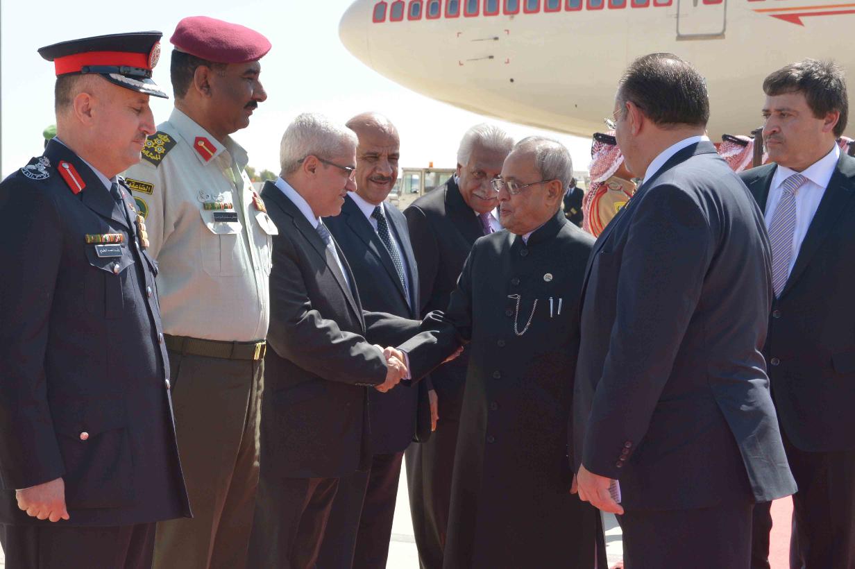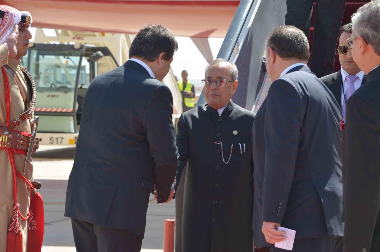 | Caption: | The President of India, Shri Pranab Mukherjee being received by the Labour Minister of Jordan, H.E. Dr. Nidal Mardi Qatamin on his arrival, at Queen Alia International Airport (Royal Pavilion), at Amman, in Jordan on October 10, 2015. |