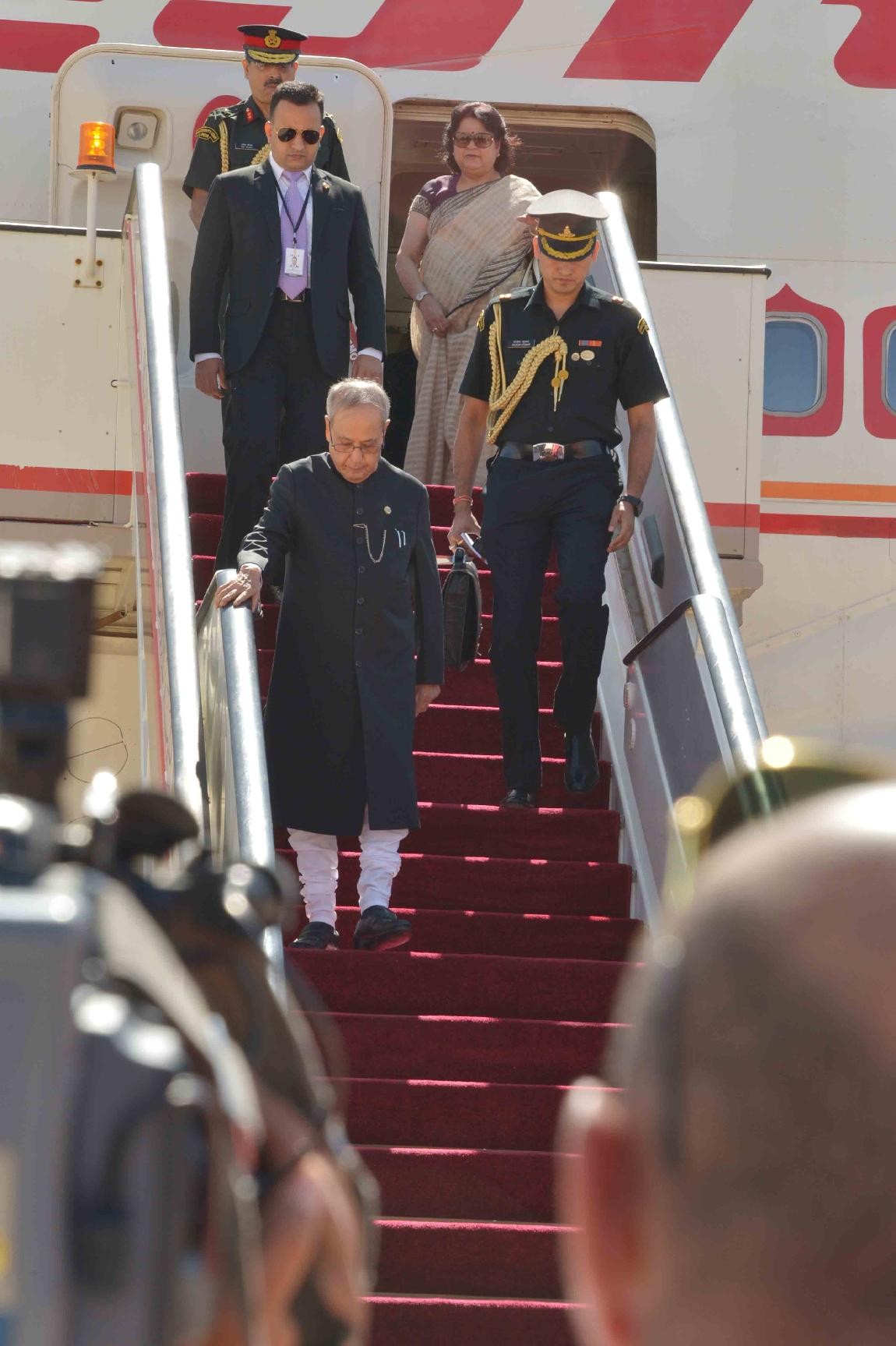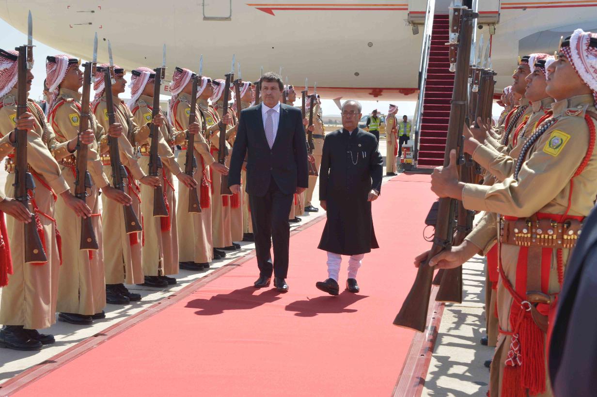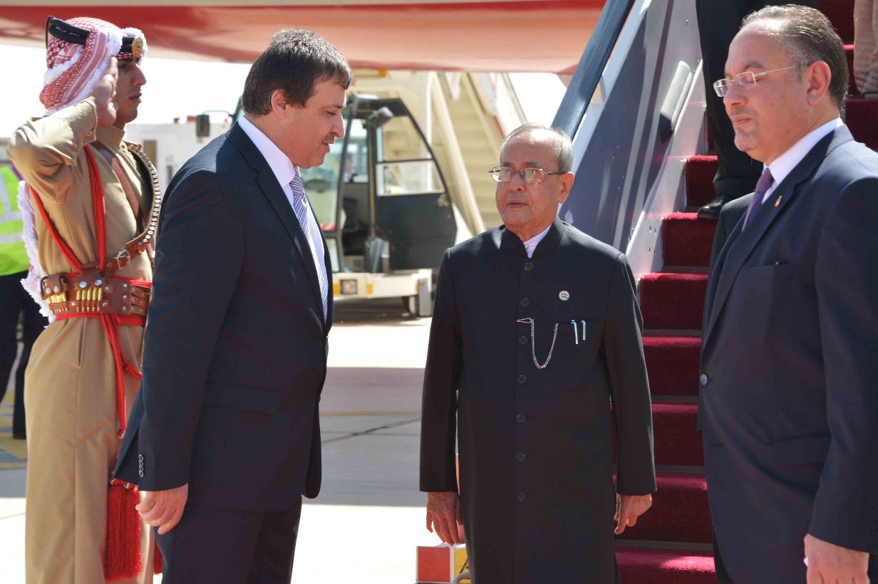 | Caption: | The President of India, Shri Pranab Mukherjee being received by the Labour Minister of Jordan, H.E. Dr. Nidal Mardi Qatamin on his arrival, at Queen Alia International Airport (Royal Pavilion), at Amman, in Jordan on October 10, 2015. |