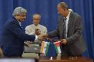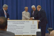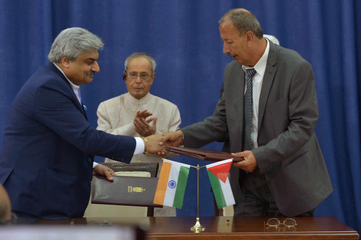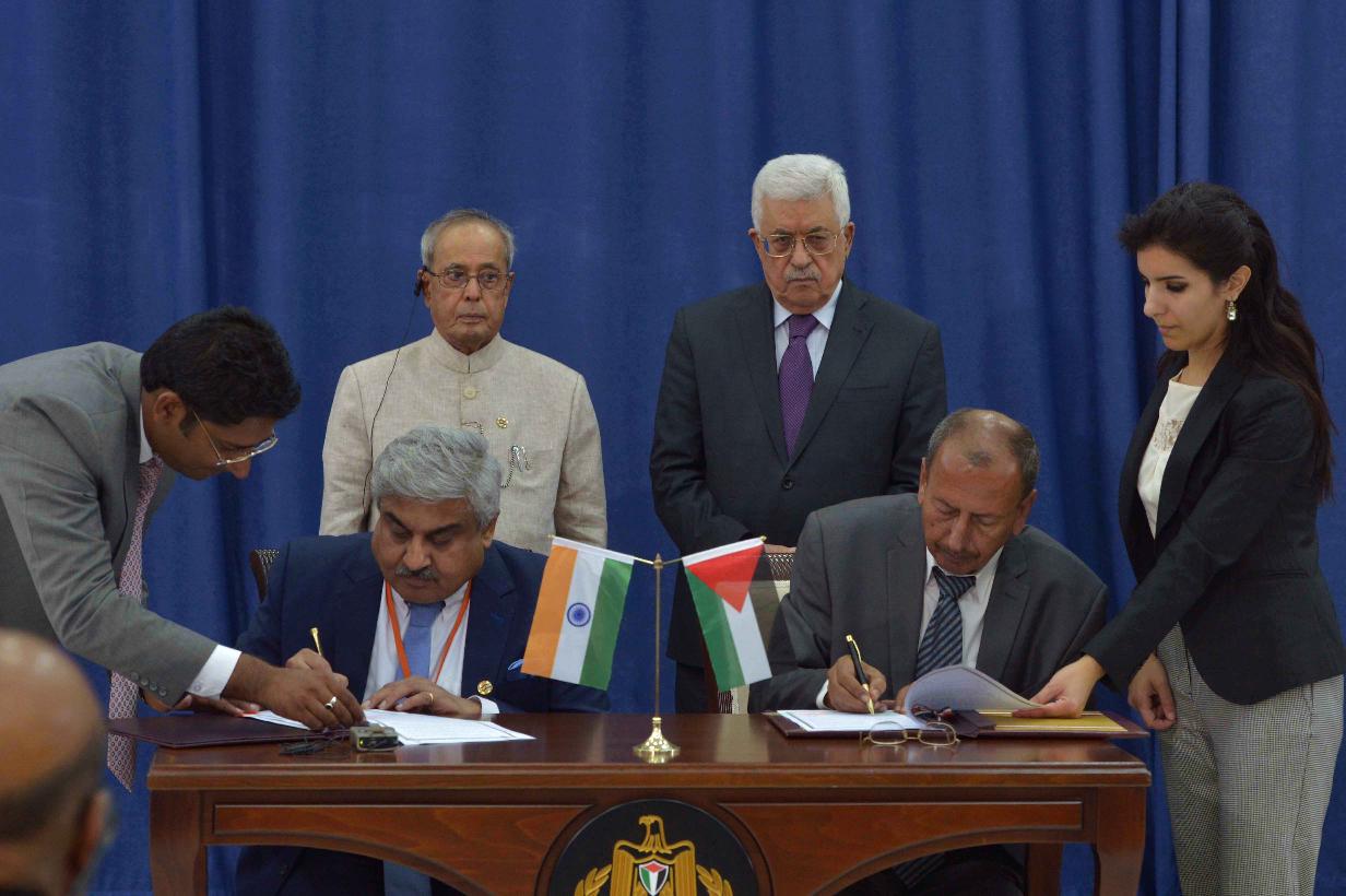 | Caption: | The President of India, Shri Pranab Mukherjee and the President of Palestine, Mr. Mahmoud Abbas witnessing signing of Agreements, at Ramallah, Palestine on October 12, 2015. |
