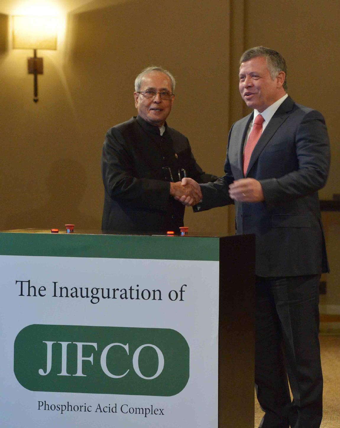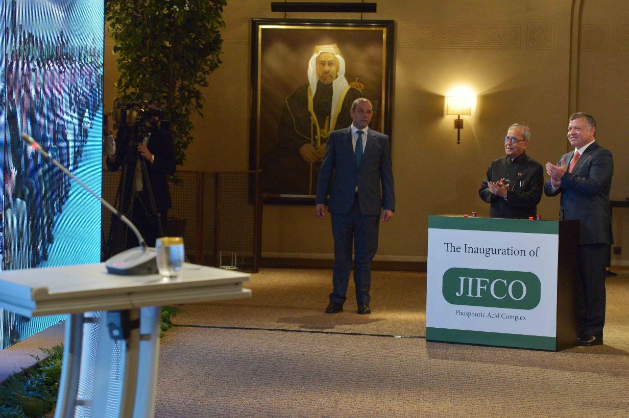 | Caption: | The President of India, Shri Pranab Mukherjee and HM King Abdullah of Jordan inaugurating the JIFFCO Plant, at Al Husseinieh Palace at Amman in Jordan on October 10, 2015 |