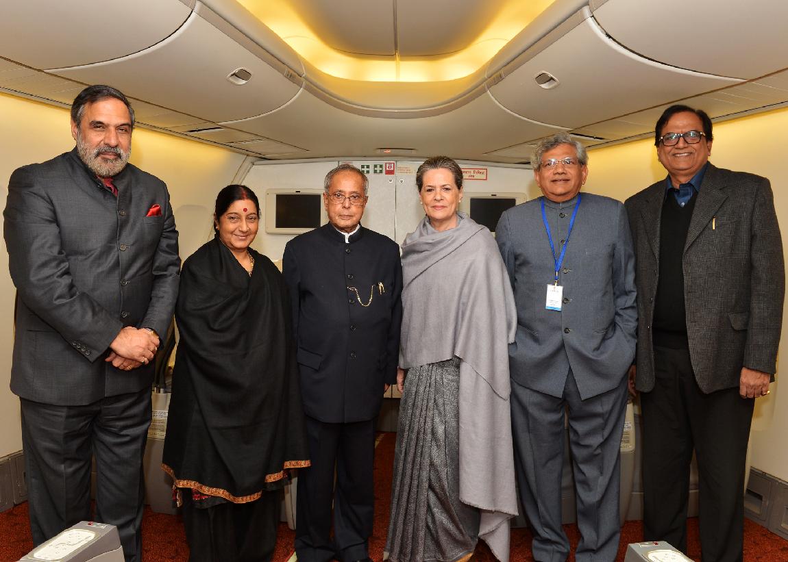 | Caption: | The President of India, Shri Pranab Mukherjee along with his Delegation Members during his visit to Pretoria at South Africa in Air India Special Aircraft Boeing 747-400 on Dec 10, 2013 |
