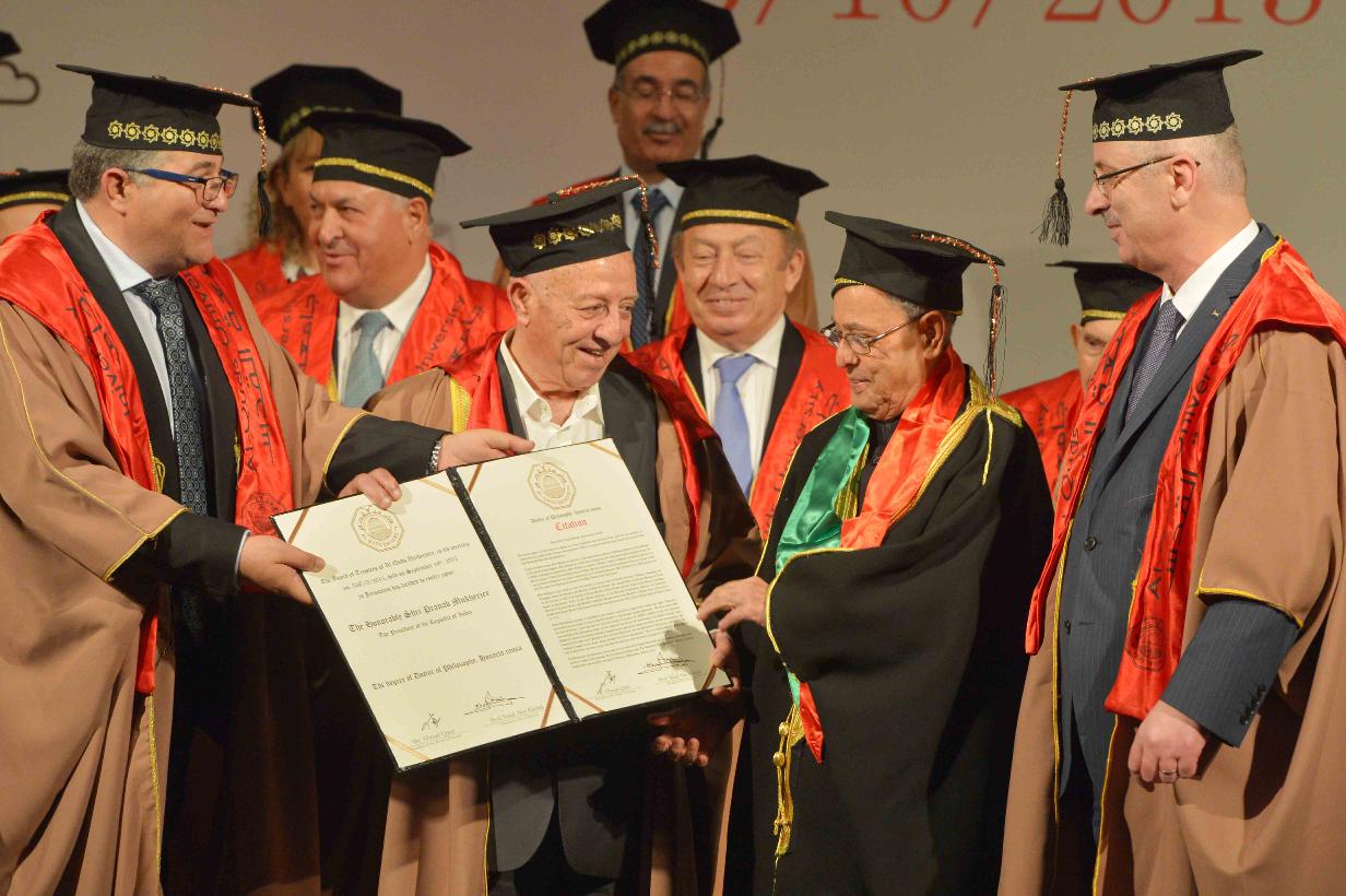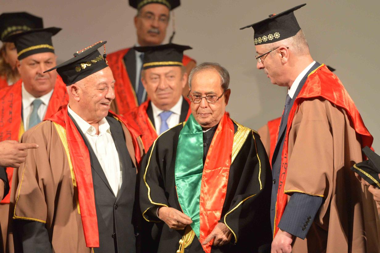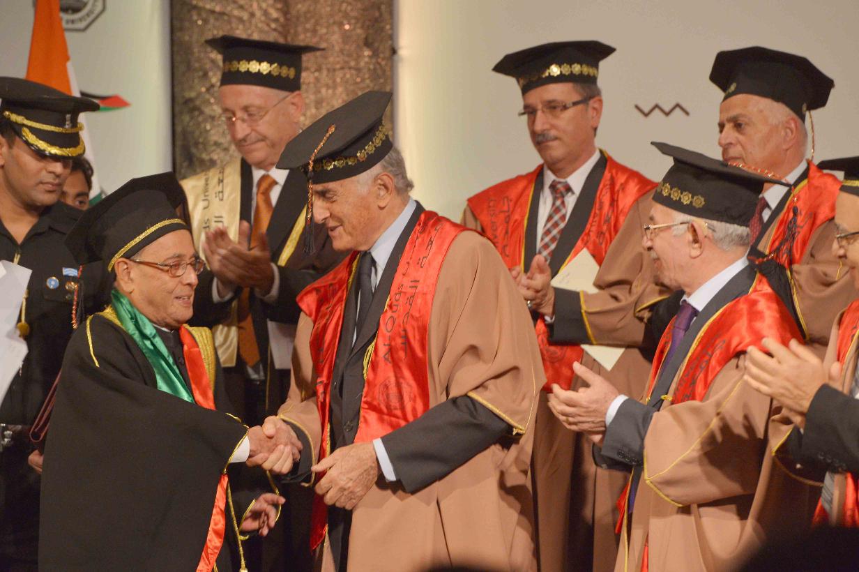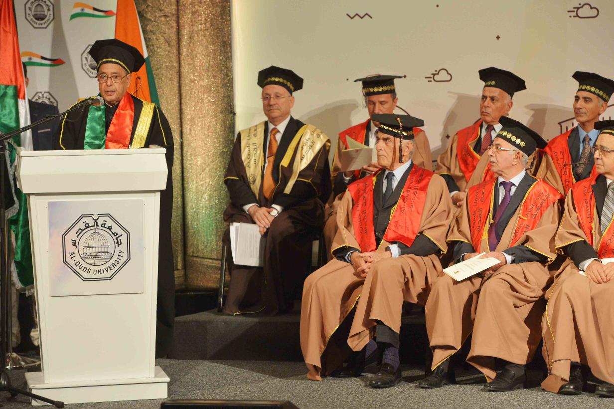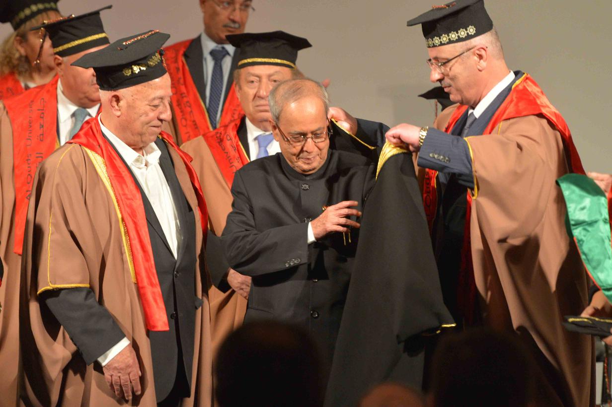 | Caption: | Al-Quds University confers Honorary Doctorate on the President of India, Shri Pranab Mukherjee, at Abu Dees, in Palestine on October 13, 2015. |