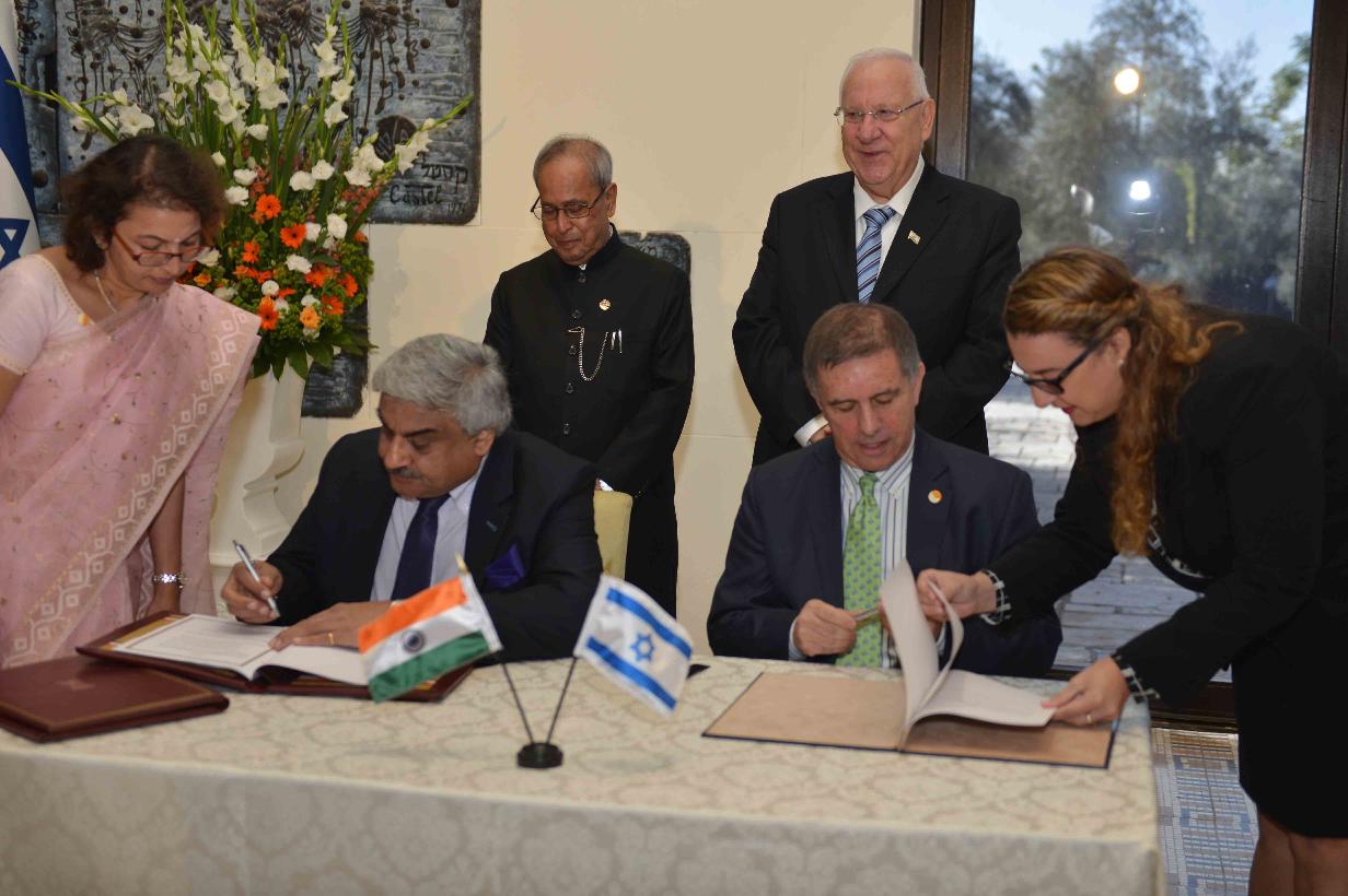 | Caption: | The President of India, Shri Pranab Mukherjee and the President of Israel, Mr. Reuven Rivlin witnessing the Signing of Agreements/MoUs at President House, Jerusalem on October 14, 2015. |