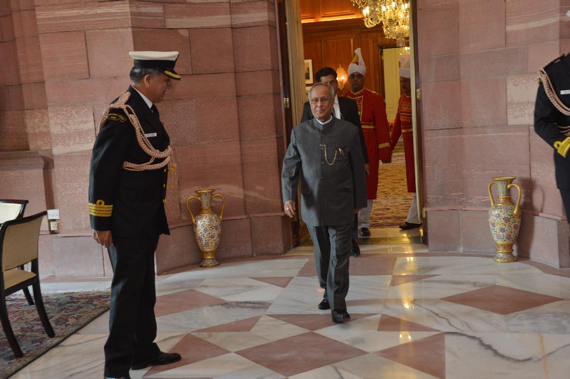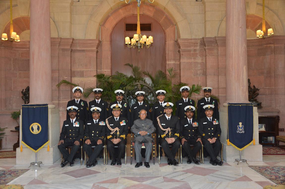 | Caption: | The President of India, Shri Pranab Mukherjee Posing for a Group Photograph with Naval Band on Dec 04, 2012 |