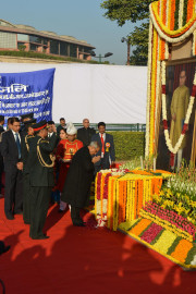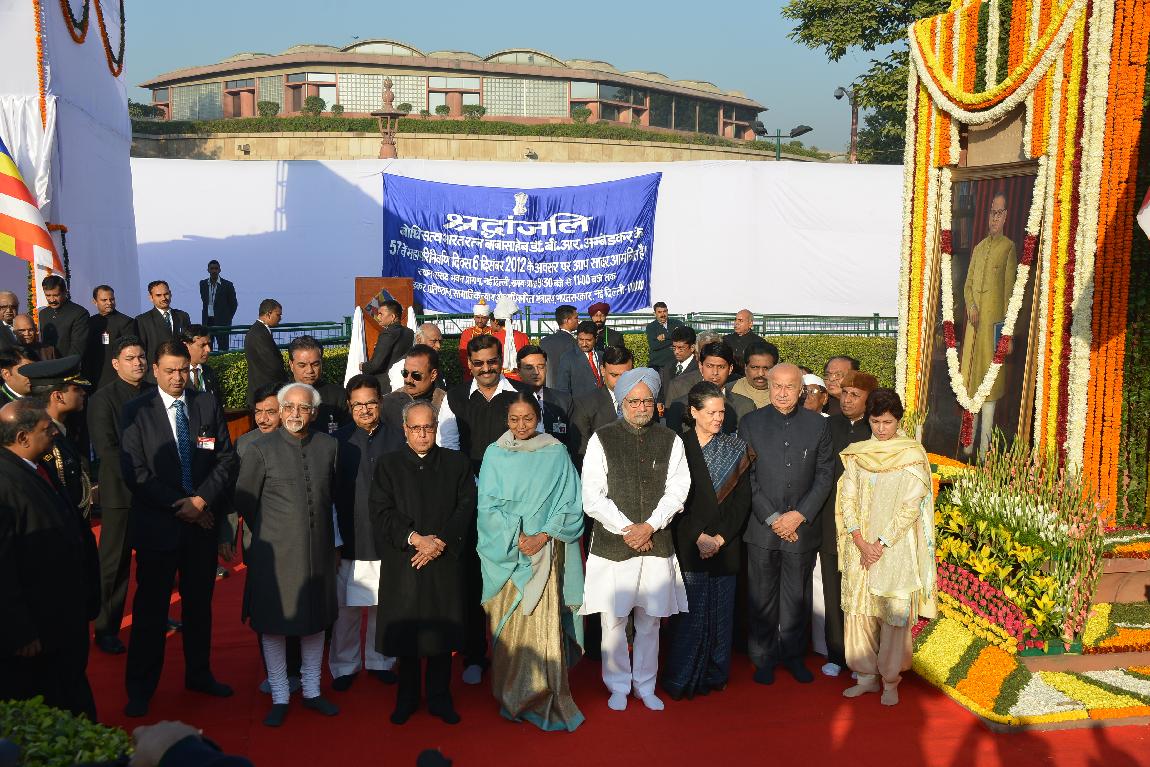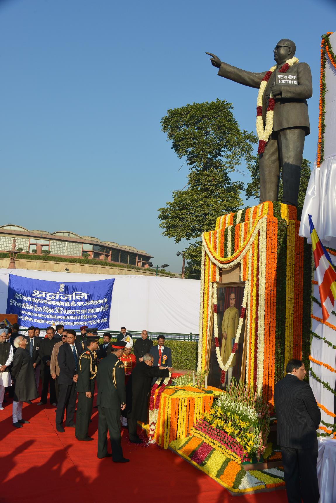 | Caption: | The President of India, Shri Pranab Mukherjee Offering Floral Tributes to The Statue of Baba Saheb Dr BR Ambedkar on Dec 06, 2012 |
