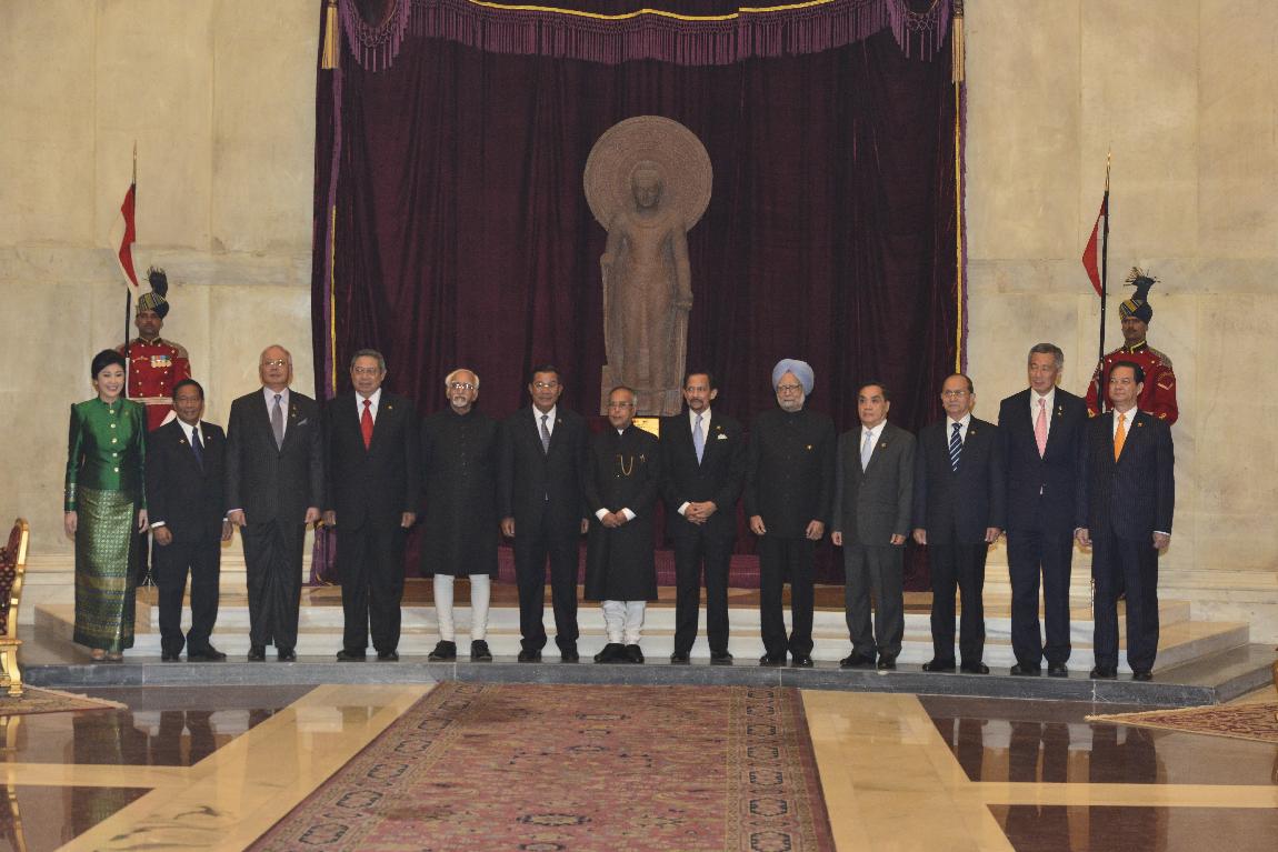 | Caption: | The President of India, Shri Pranab Mukherjee Posing for a Group Photograph with Delegation of ASEAN-India Special Commemorative Summit (Call on & Farewell) on Dec 20, 2012 |