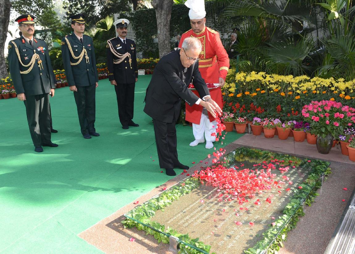 | Caption: | The President of India, Shri Pranab Mukherjee paying his floral tributes to the Former Prime Minister of India, Smt Indira Gandhi on the occasion of her 96th Birth Anniversary at No-1 Safdarjung Road in New Delhi on Nov 19, 2013 |