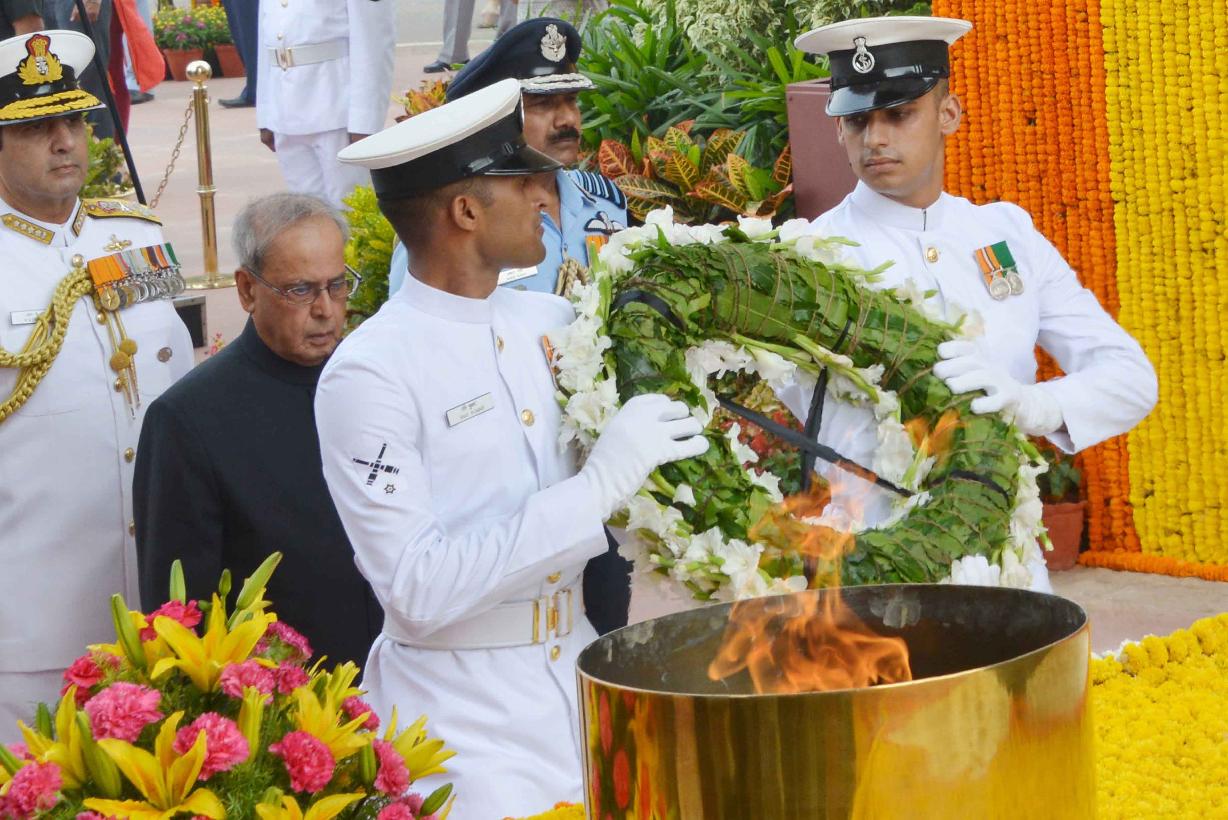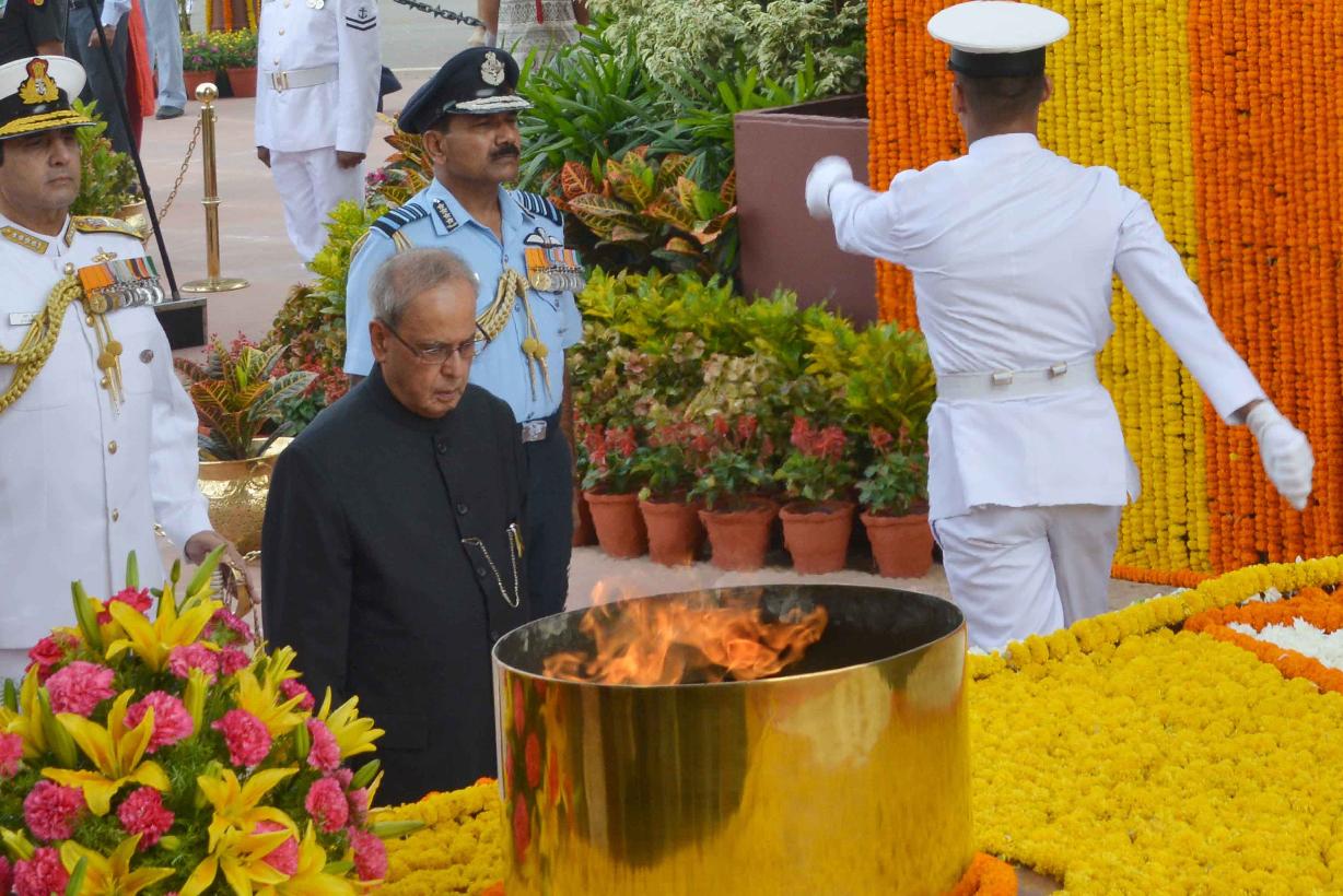 | Caption: | The President of India, Shri Pranab Mukherjee paying homage at Amar Jawan Jyoti to mark the Golden Jubilee of India's Victory in Indo-Pak War of 1965, in New Delhi on August 28, 2015. |