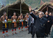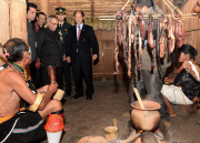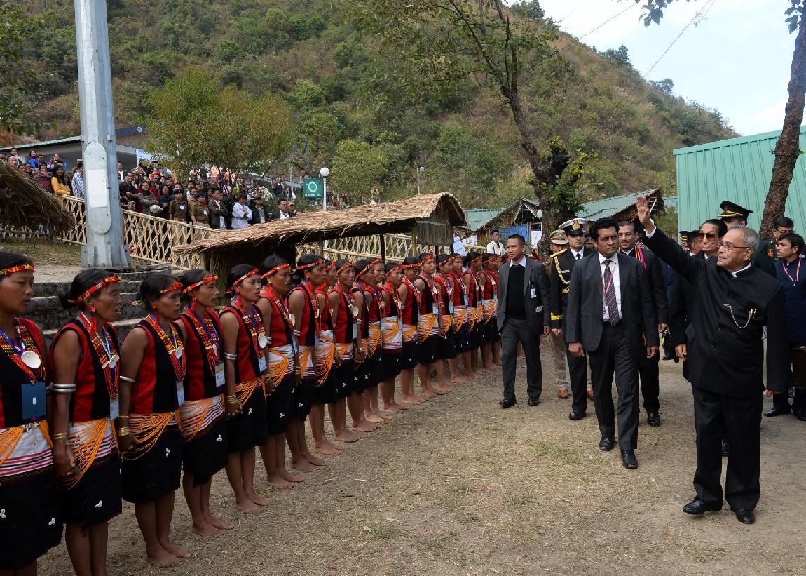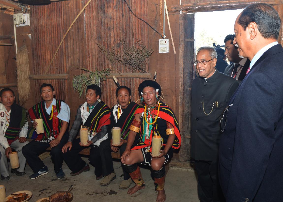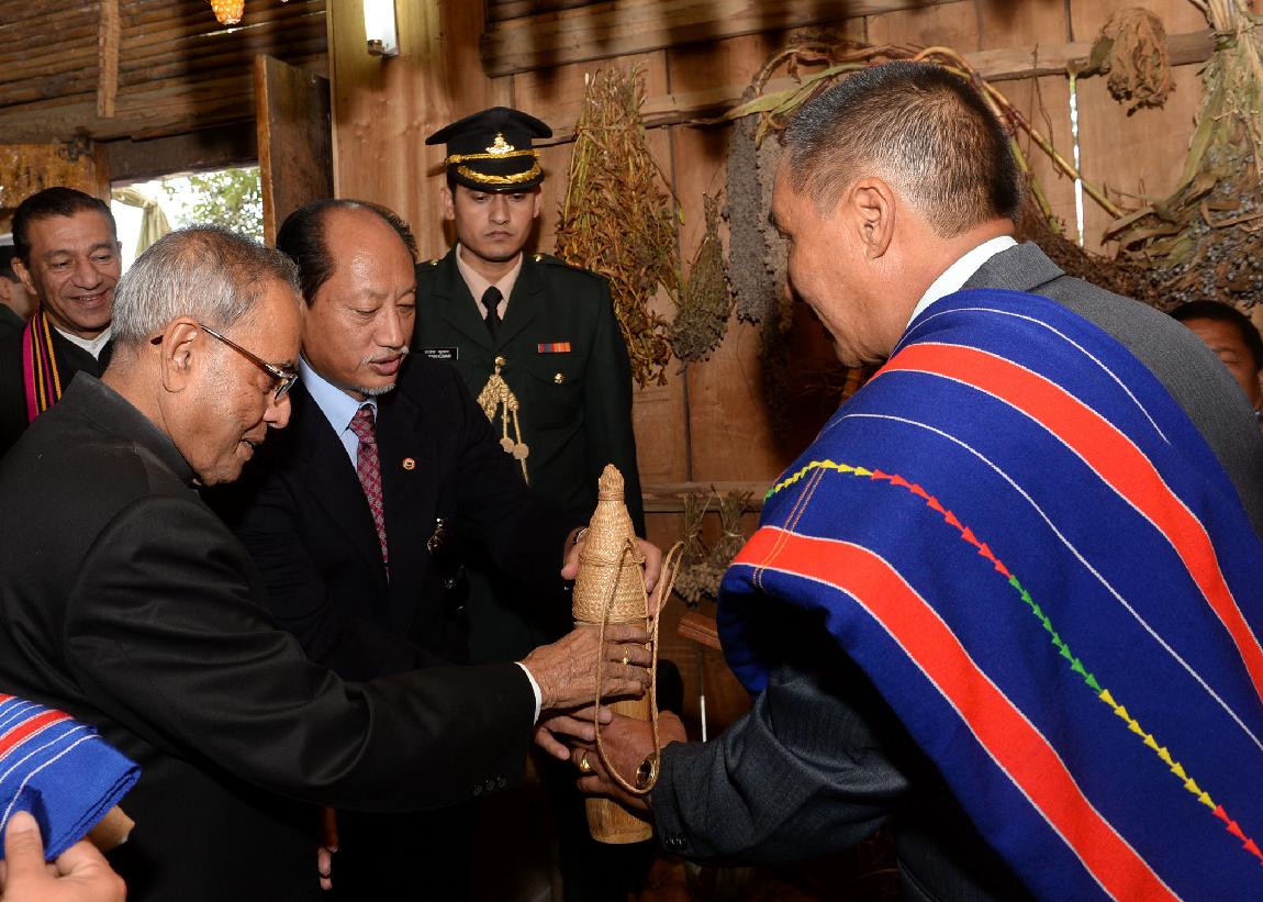 | Caption: | The President of India, Shri Pranab Mukherjee visiting the Pochury and Chakhesang Morung (Tribal Huts with Tribal People) at Window of Nagaland Gate in Kisama, Nagaland on Dec 01, 2013 |