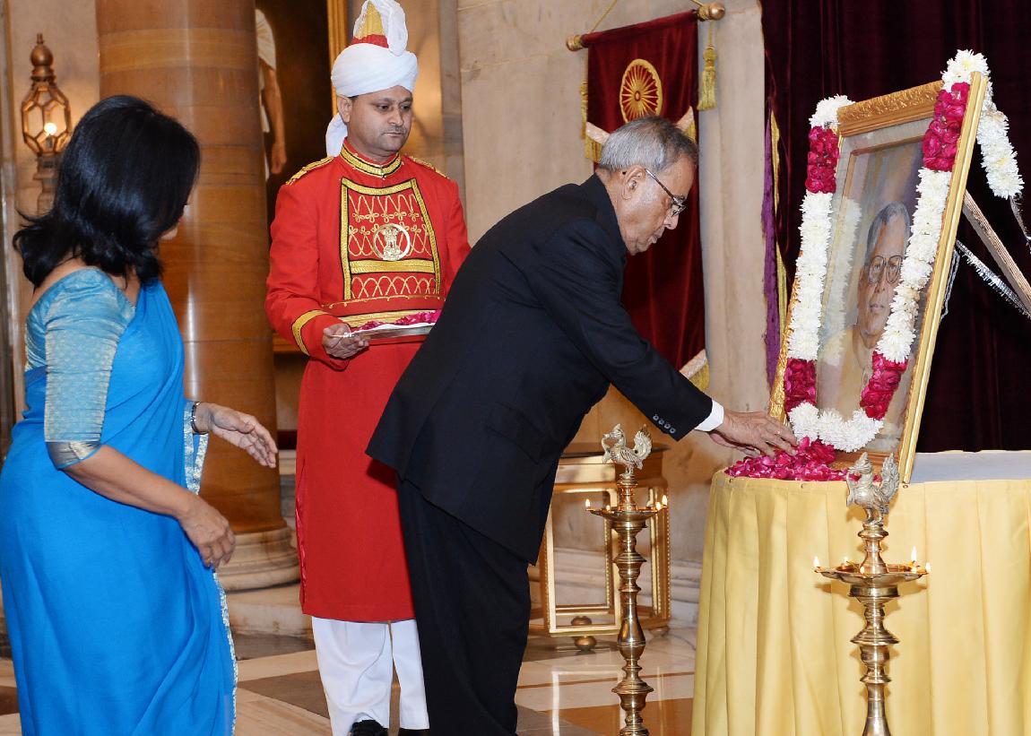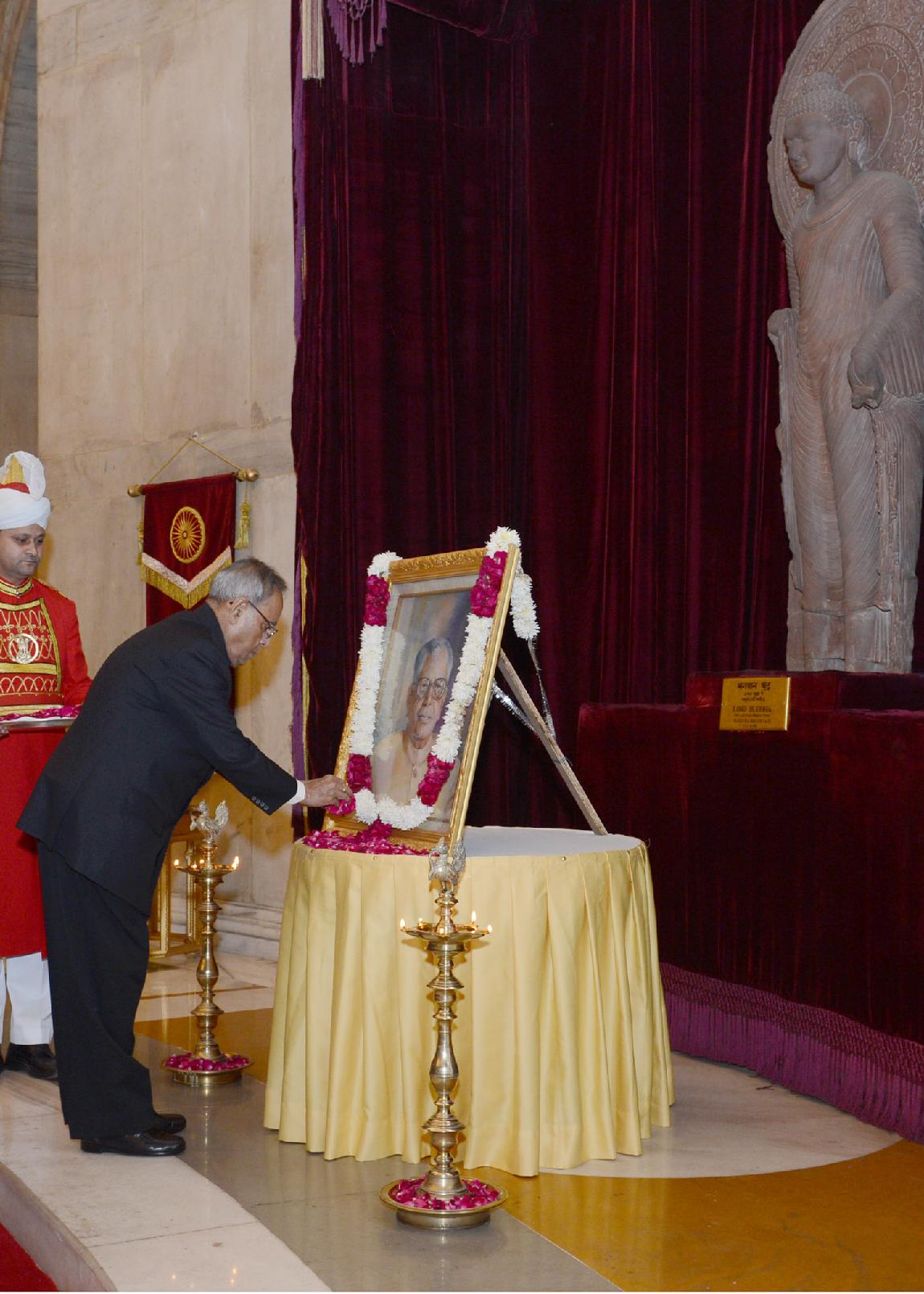 | Caption: | The President of India, Shri Pranab Mukherjee paying floral tributes at the Portrait of the Former President of India, Shri R Venkataraman on the occasion of his Birth Anniversary at Darbar Hall of Rashtrapati Bhavan in New Delhi on Dec 04, 2013 |