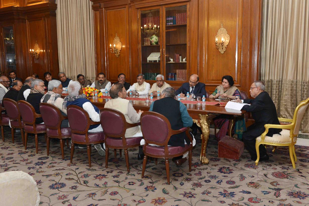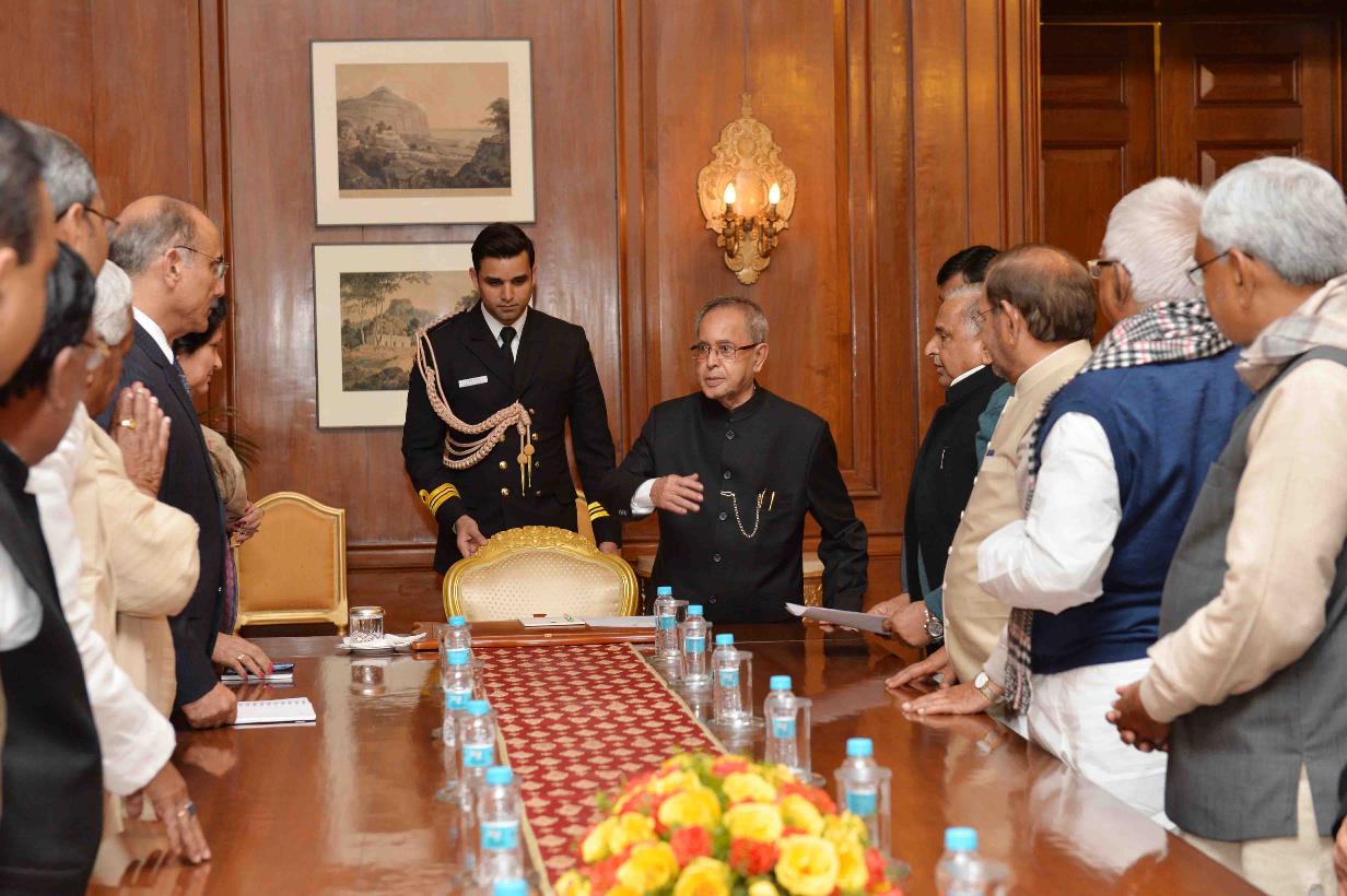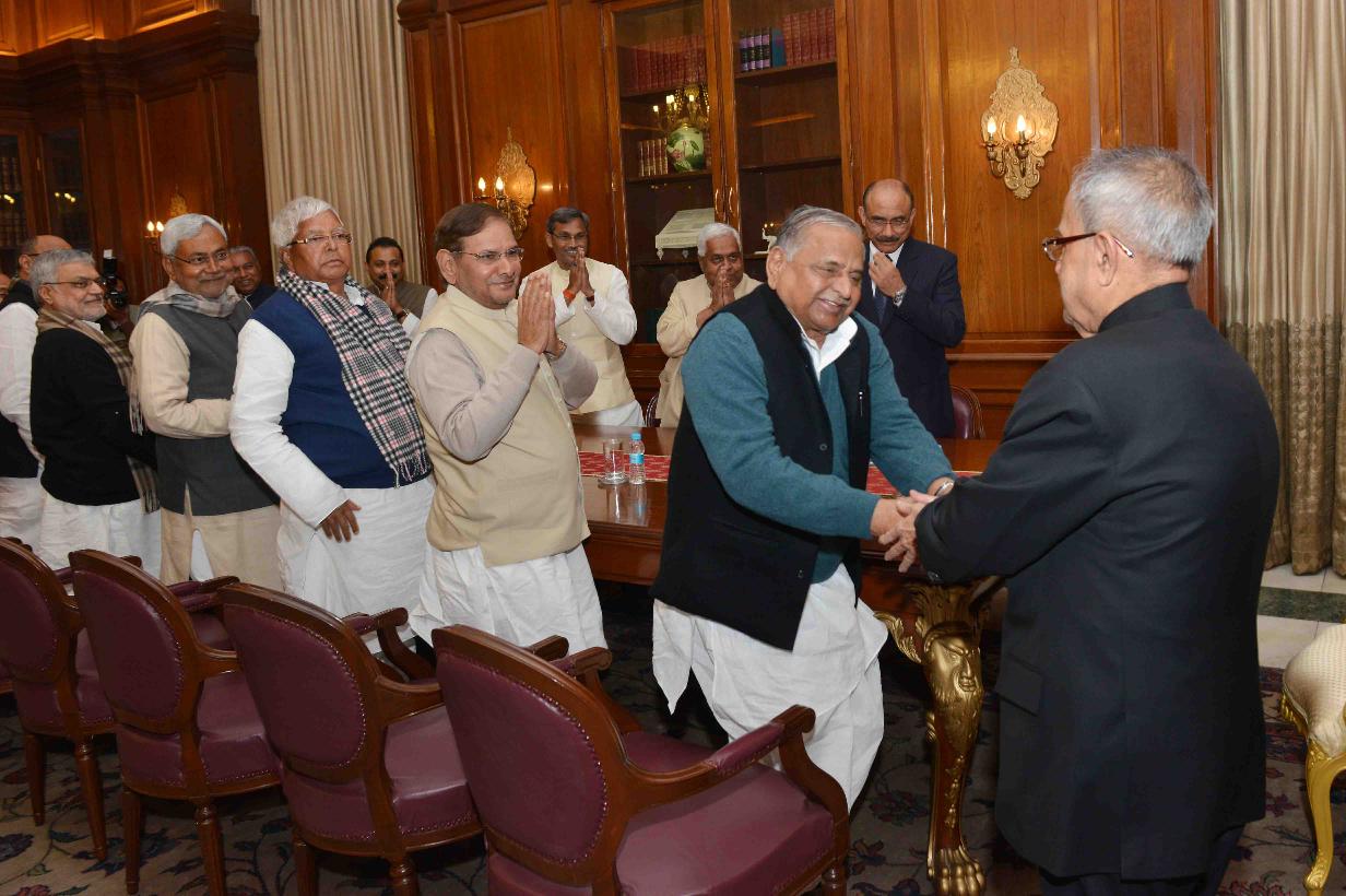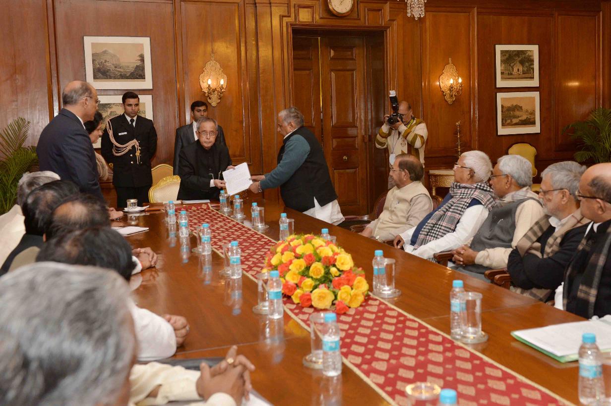| Caption: | The President, Janta Dal United, Shri Sharad Yadav, the President, Rashtriya Janta Dal, Shri Lalu Prasad, the President, Swajwadi Party, Shri Mulayam Singh Yadav, the Member Parliament (Rajya Sabha), Shri KC Tyagi with Others, meeting the President of India, Shri Pranab Mukherjee, at Rashtrapati Bhavan, in New Delhi on February 11, 2015. |