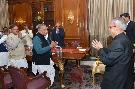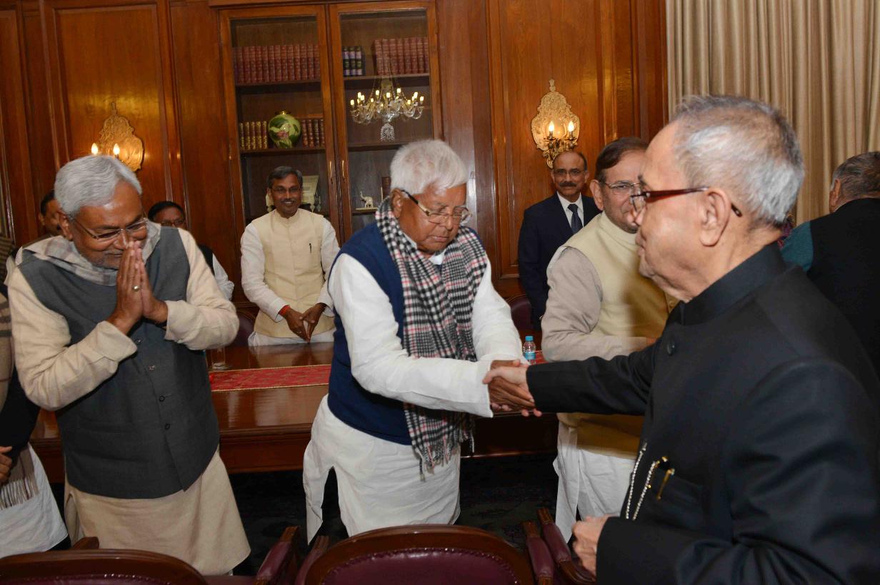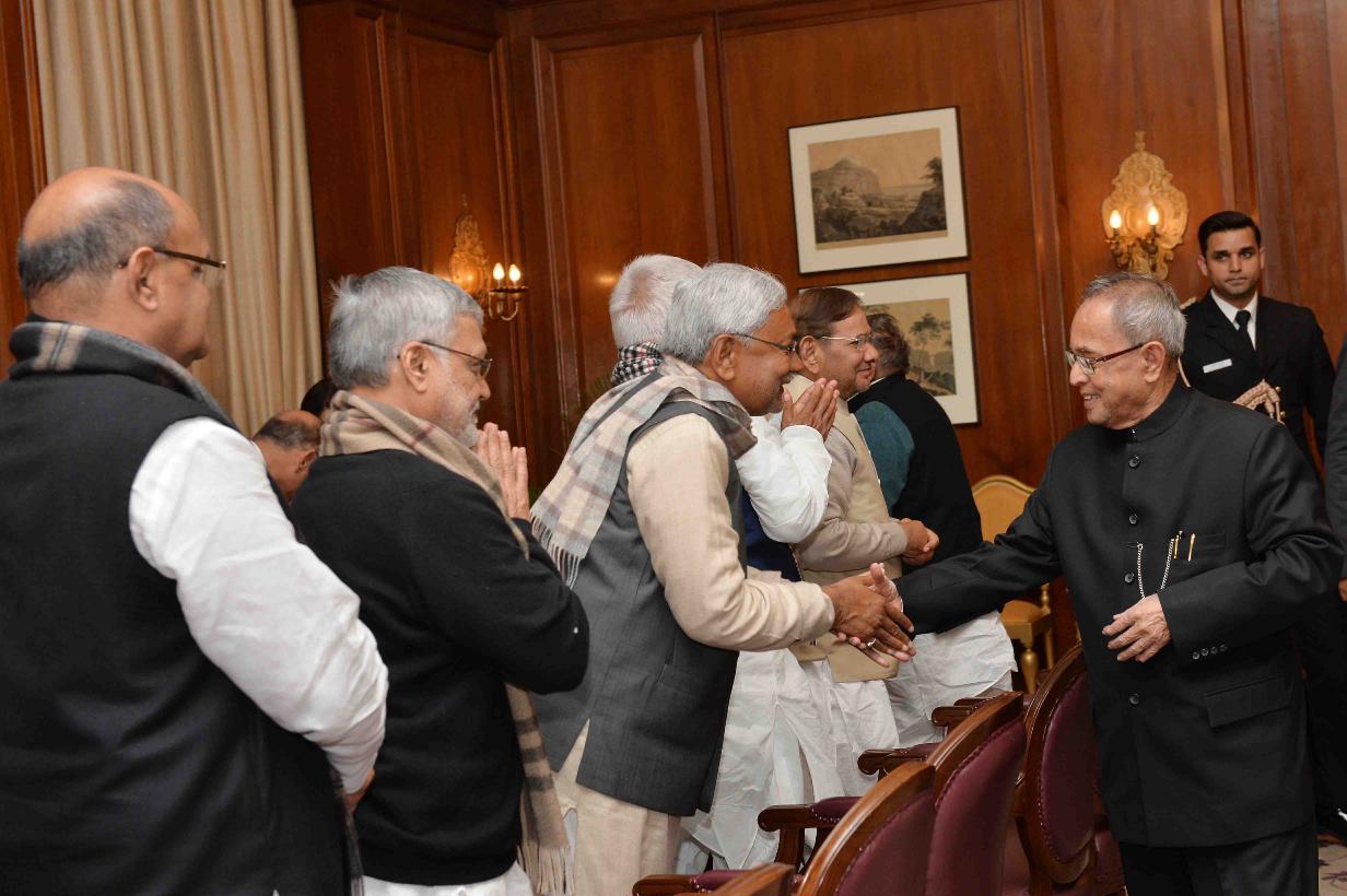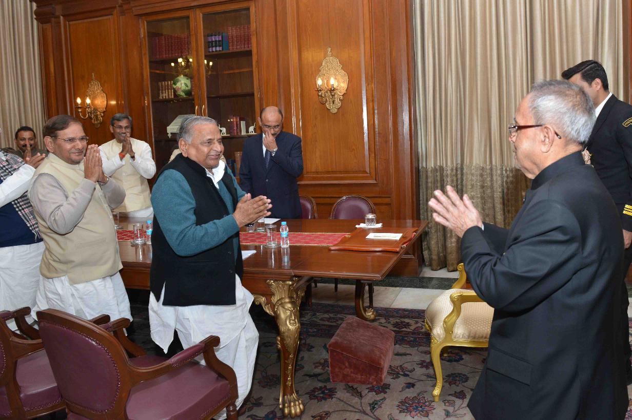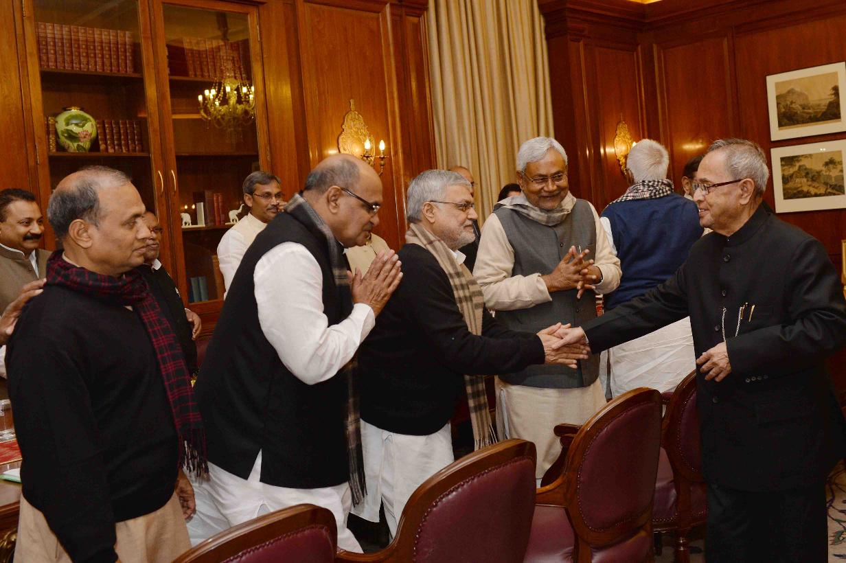 | Caption: | The President, Janta Dal United, Shri Sharad Yadav, the President, Rashtriya Janta Dal, Shri Lalu Prasad, the President, Swajwadi Party, Shri Mulayam Singh Yadav, the Member Parliament (Rajya Sabha), Shri KC Tyagi with Others, meeting the President of India, Shri Pranab Mukherjee, at Rashtrapati Bhavan, in New Delhi on February 11, 2015. |