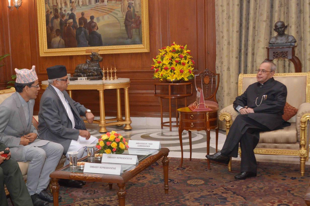 | Caption: | The Ambassador-Designate of Nepal, HE Mr. Deep Kumar Upadhyay presenting his Credentials to the President of India, Shri Pranab Mukherjee, at Rashtrapati Bhavan, in New Delhi on April 30, 2015. |