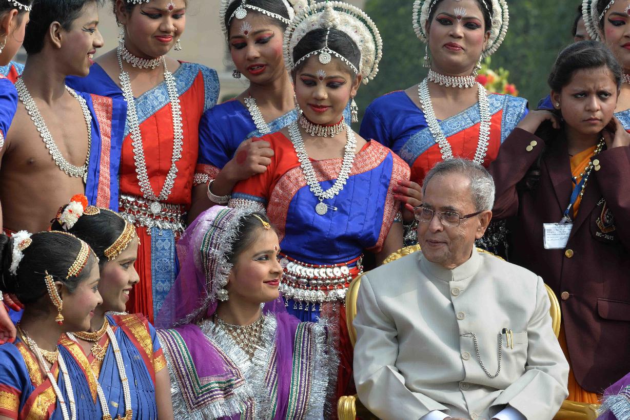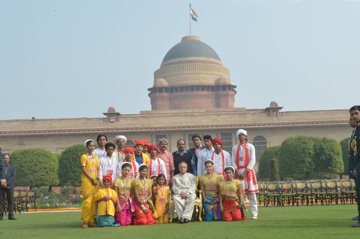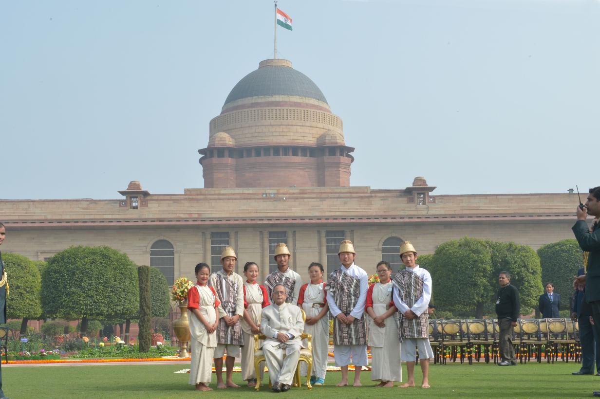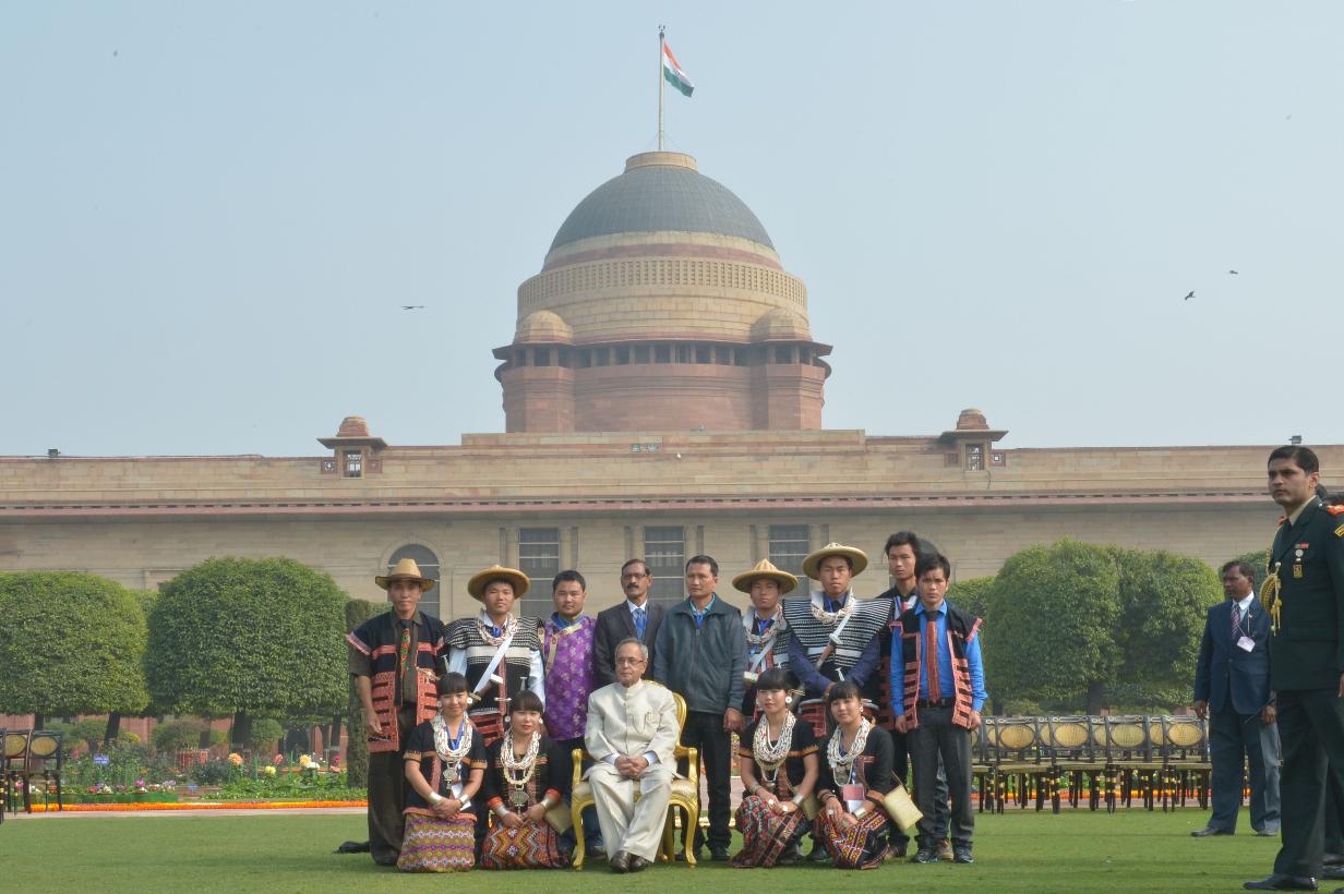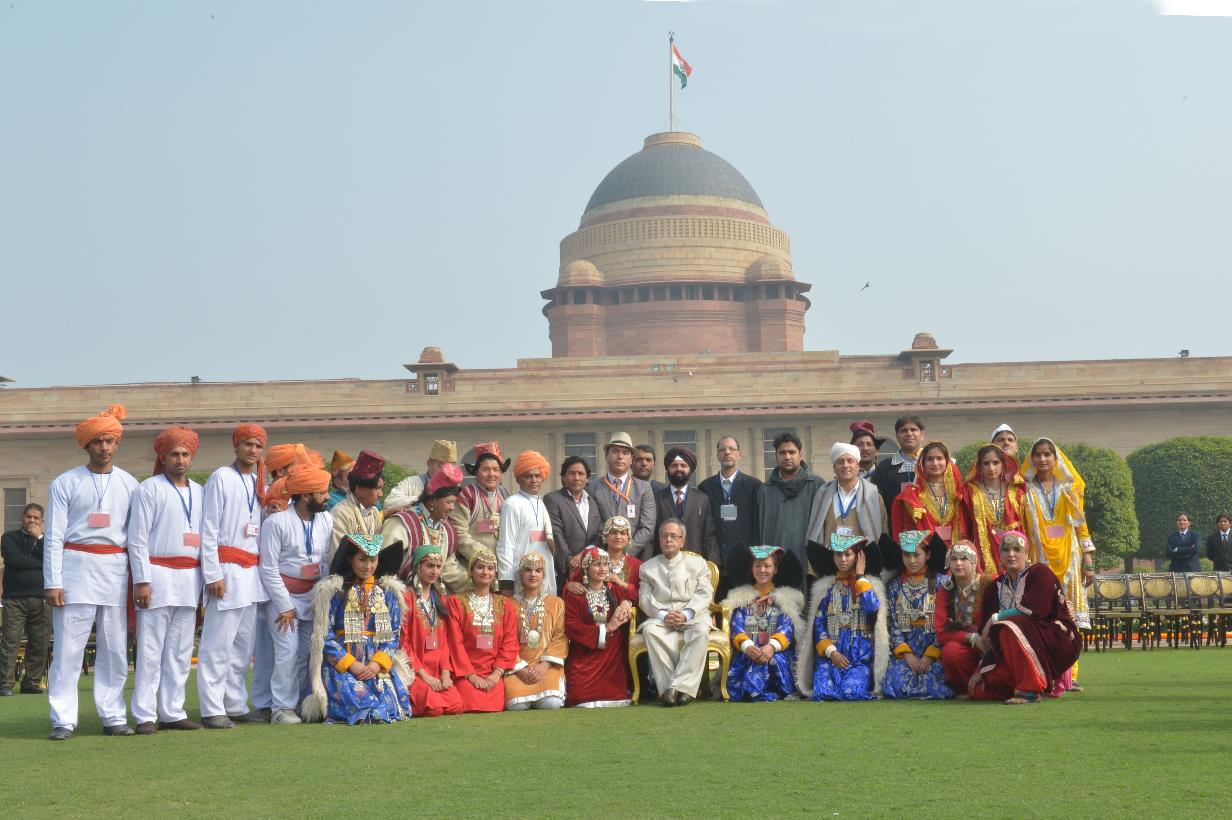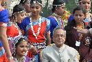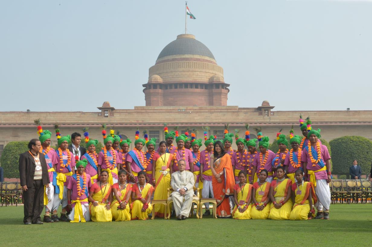| Caption: | The President of India, Shri Pranab Mukherjee meeting with the Tribal Guests, Tableaux Artists, NCC Volunteers and NCC Cadets, at Rashtrapati Bhavan, in New Delhi on January 27, 2015 |