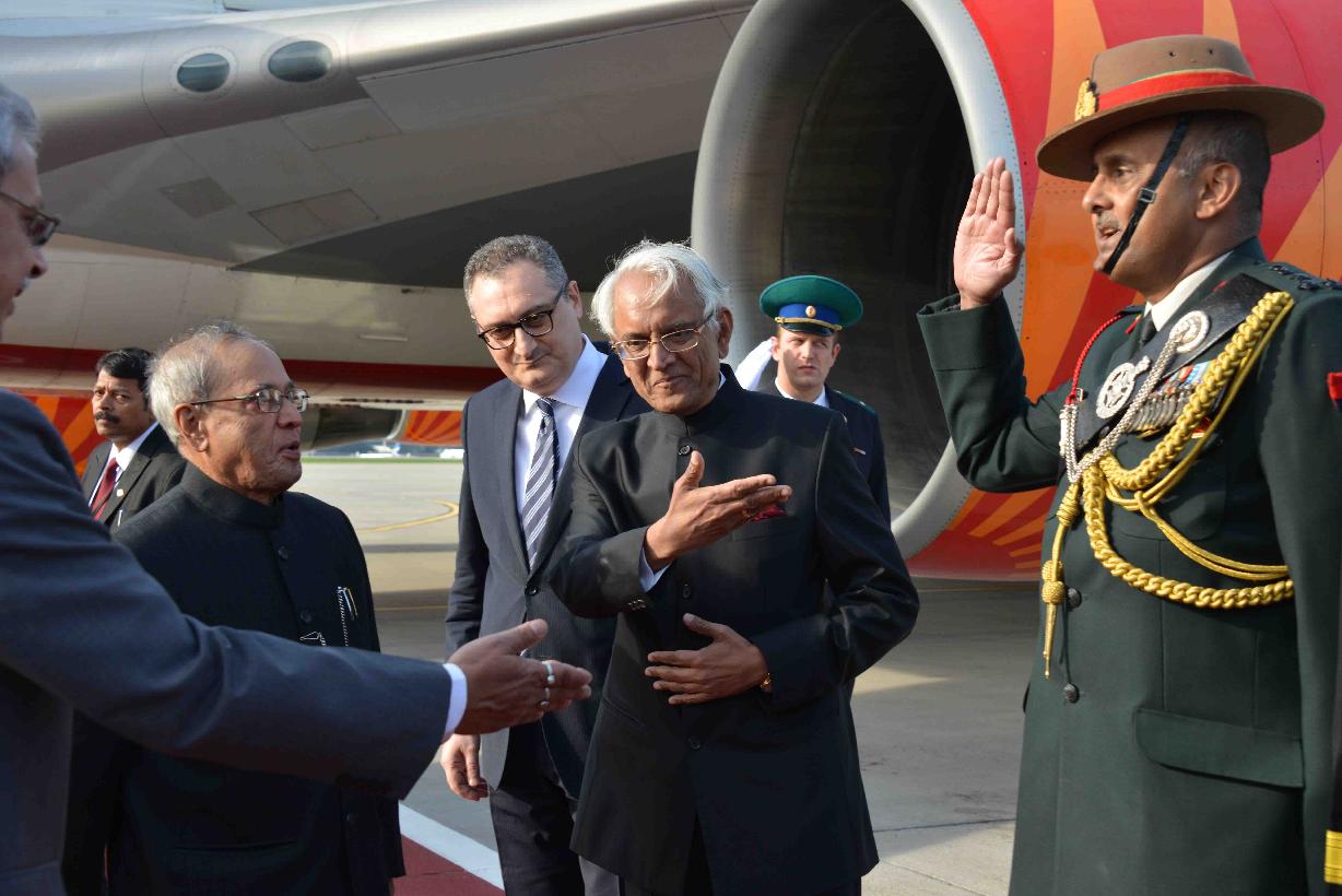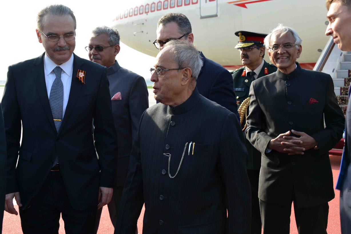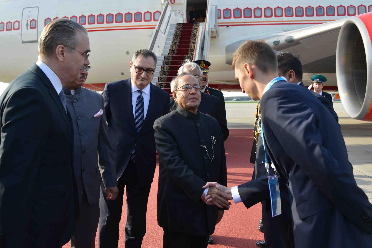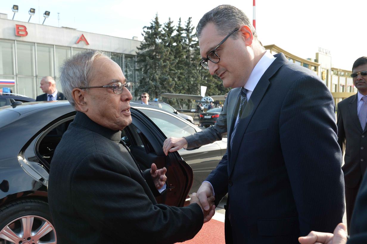 | Caption: | The President of India, Shri Pranab Mukherjee being received by the Deputy Minister of Foreign Affairs of Russia, Mr. Igor Morgulov, Russian Dignitaries, Officials and Indian Embassy Officials on his arrival, at Vnukovo International Airport, Moscow, in Russia on May 07, 2015. |