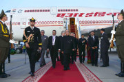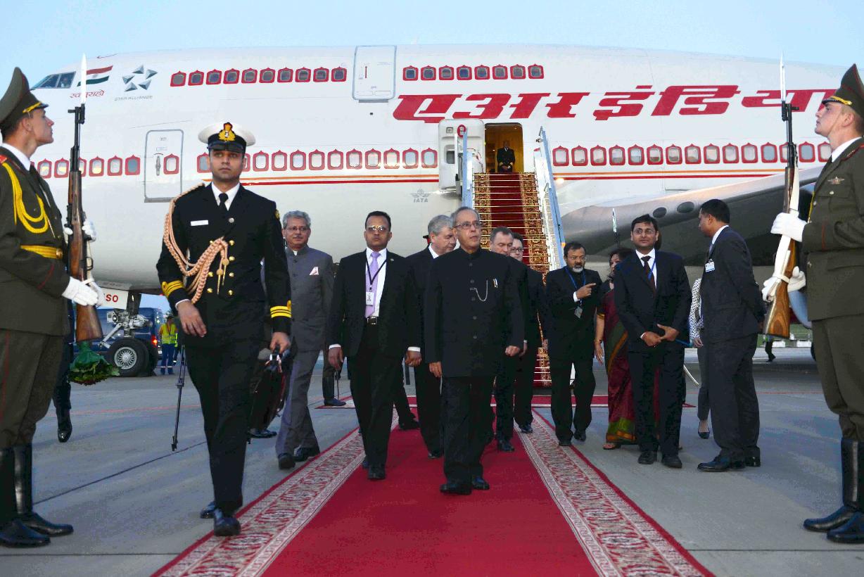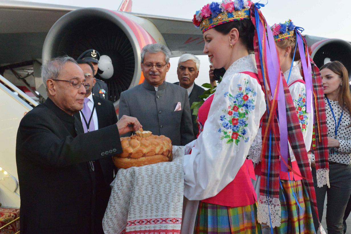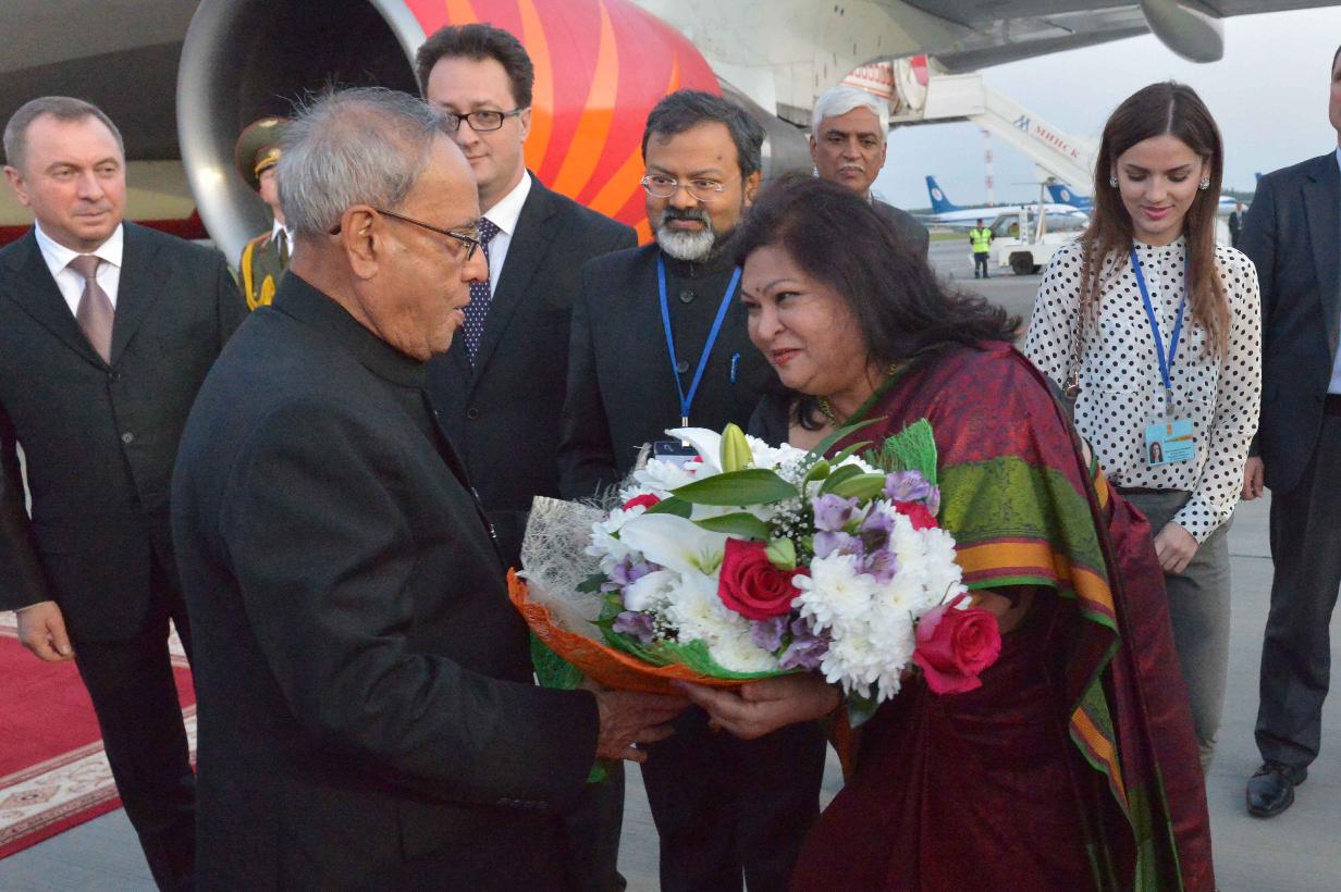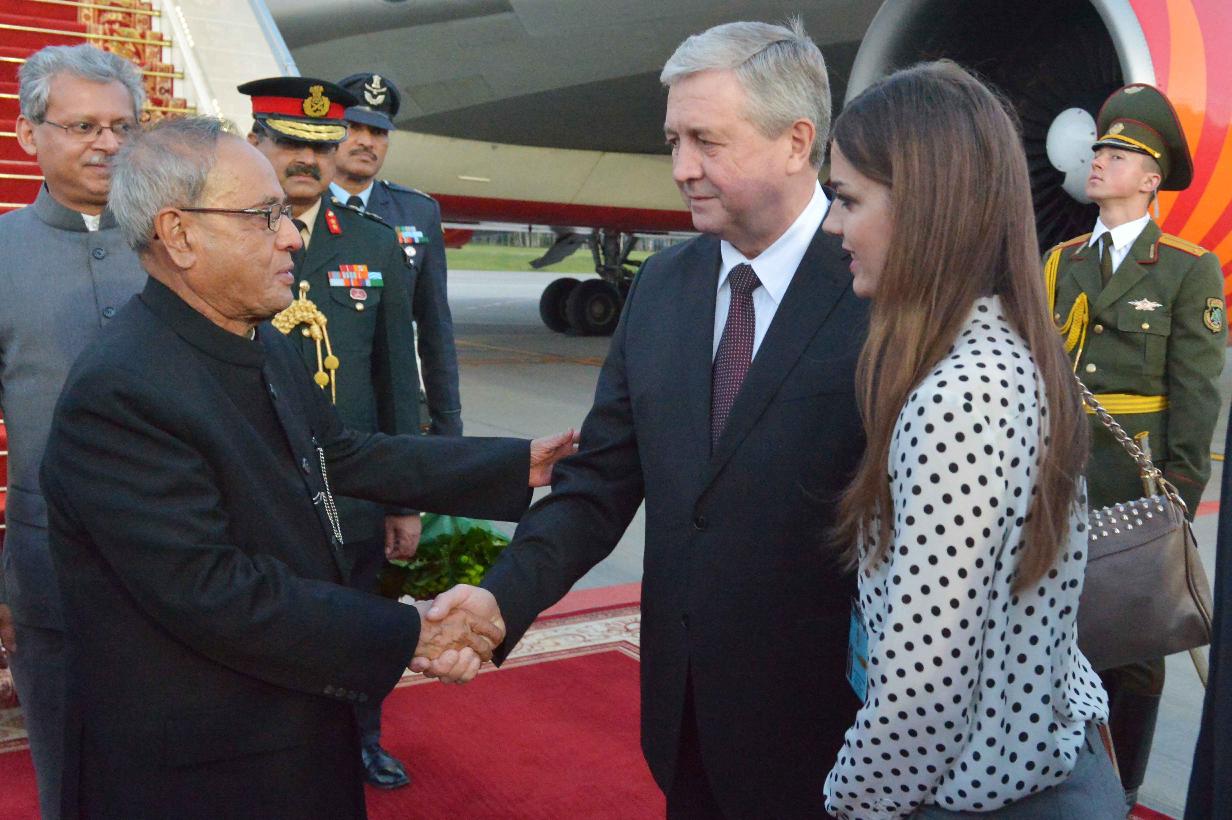 | Caption: | The President of India, Shri Pranab Mukherjee being received by the Deputy Prime Minister of Republic of Belarus, Mr. Vladimir I Semashko, Belarusian Dignitaries and Indian Embassy Officials, on his arrival, at Minsk International Airport, in Republic of Belarus on June 02, 2015. |