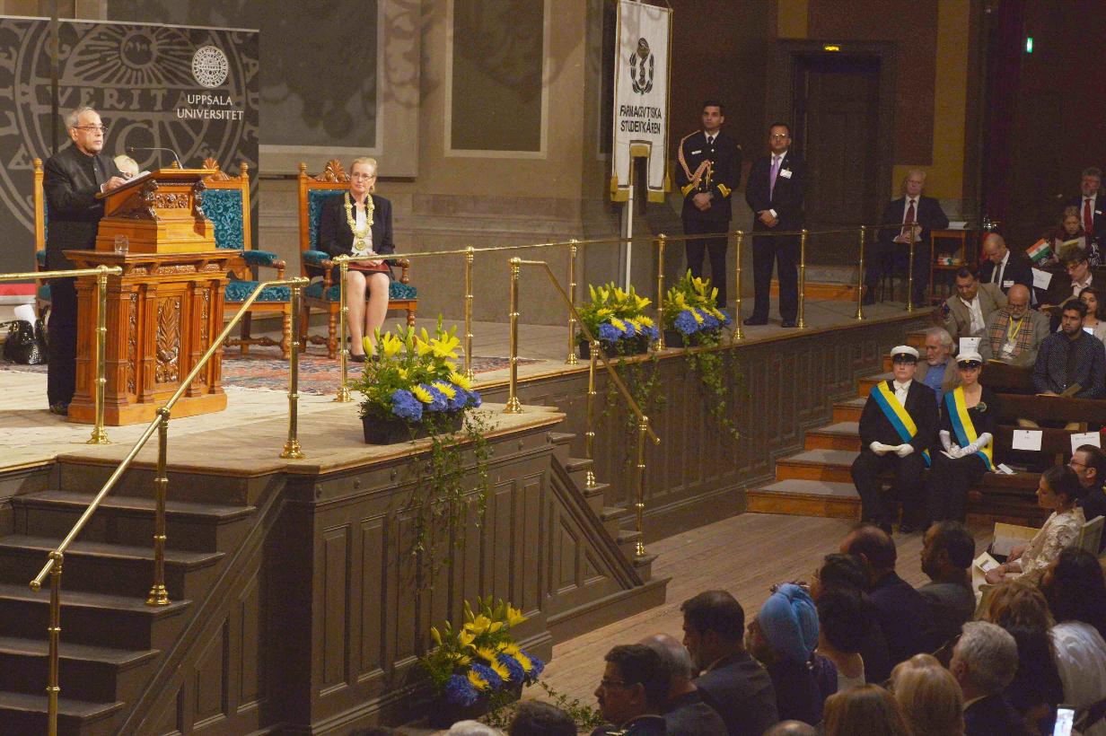 | Caption: | The President of India, Shri Pranab Mukherjee addressing at the Uppsala University, during his State visit of Sweden, in Stockholm on June 02, 2015. |
