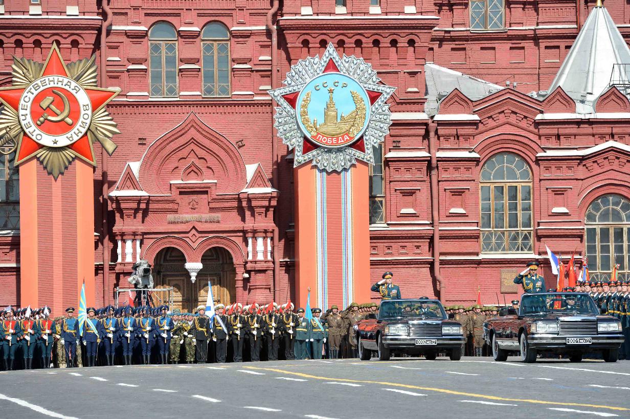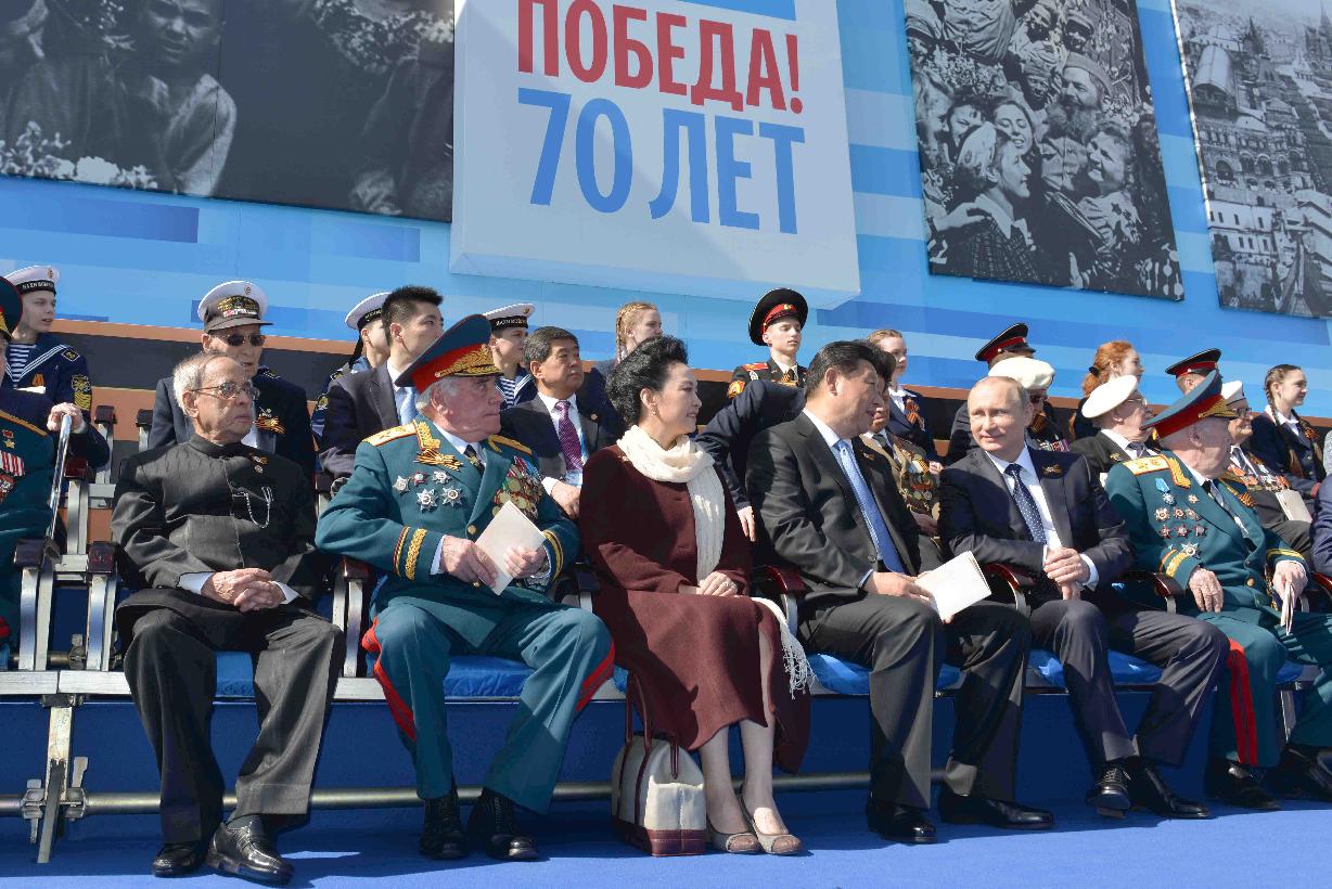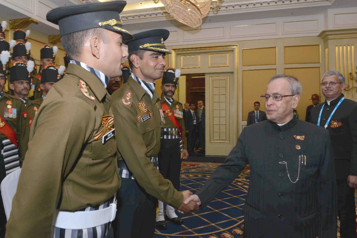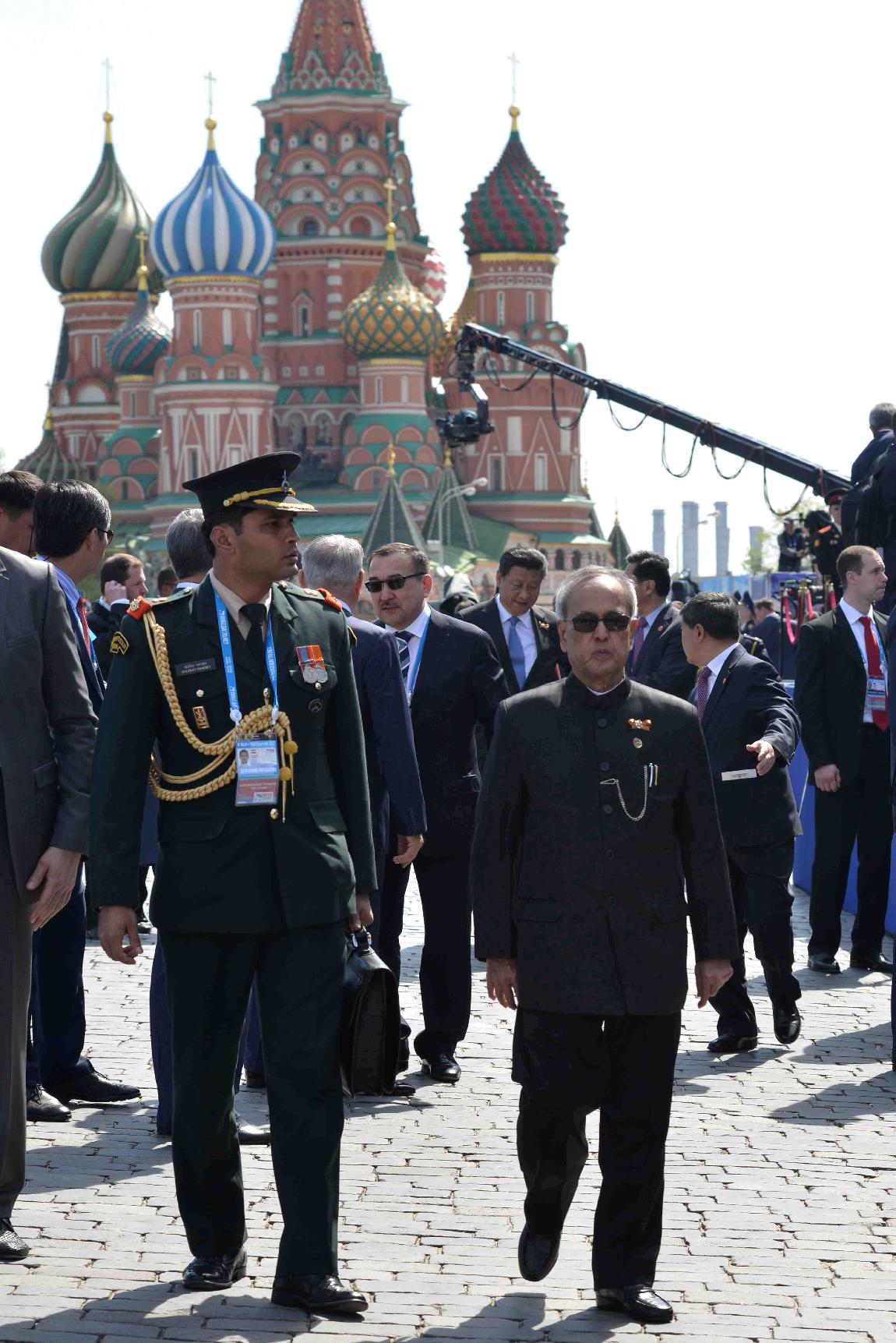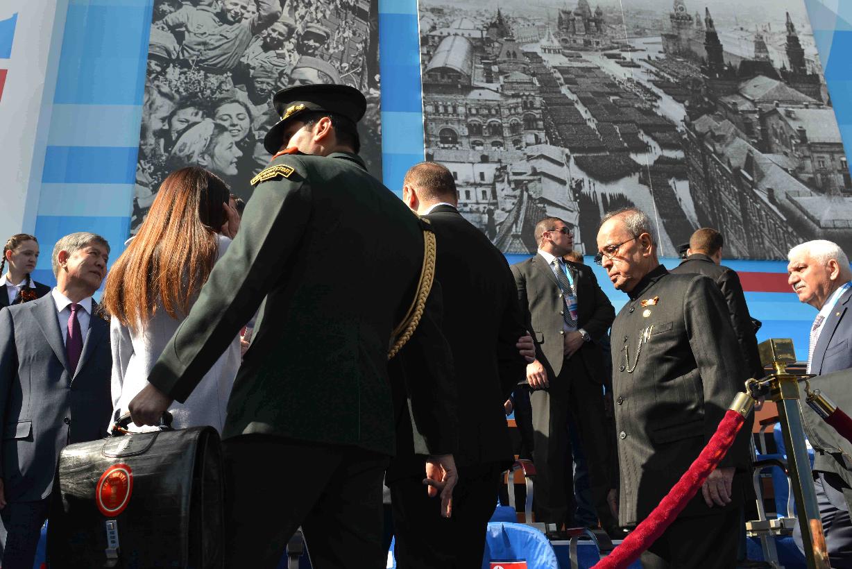 | Caption: | The President of India, Shri Pranab Mukherjee witnessing the Victory Day Commemoration along with the President of the Russian Federation, H.E. Mr. Vladimir V Putin and other Leaders, at Red Square, in Moscow, Russia on May 09, 2015. |