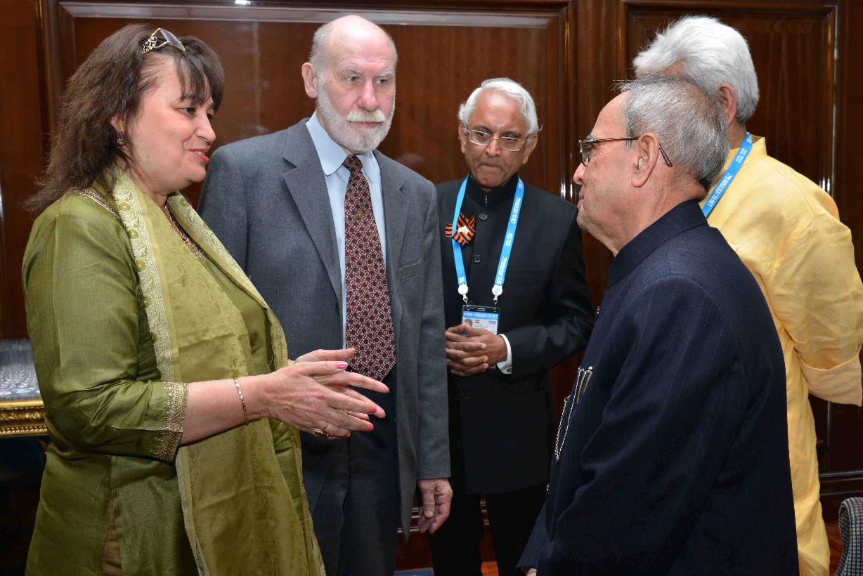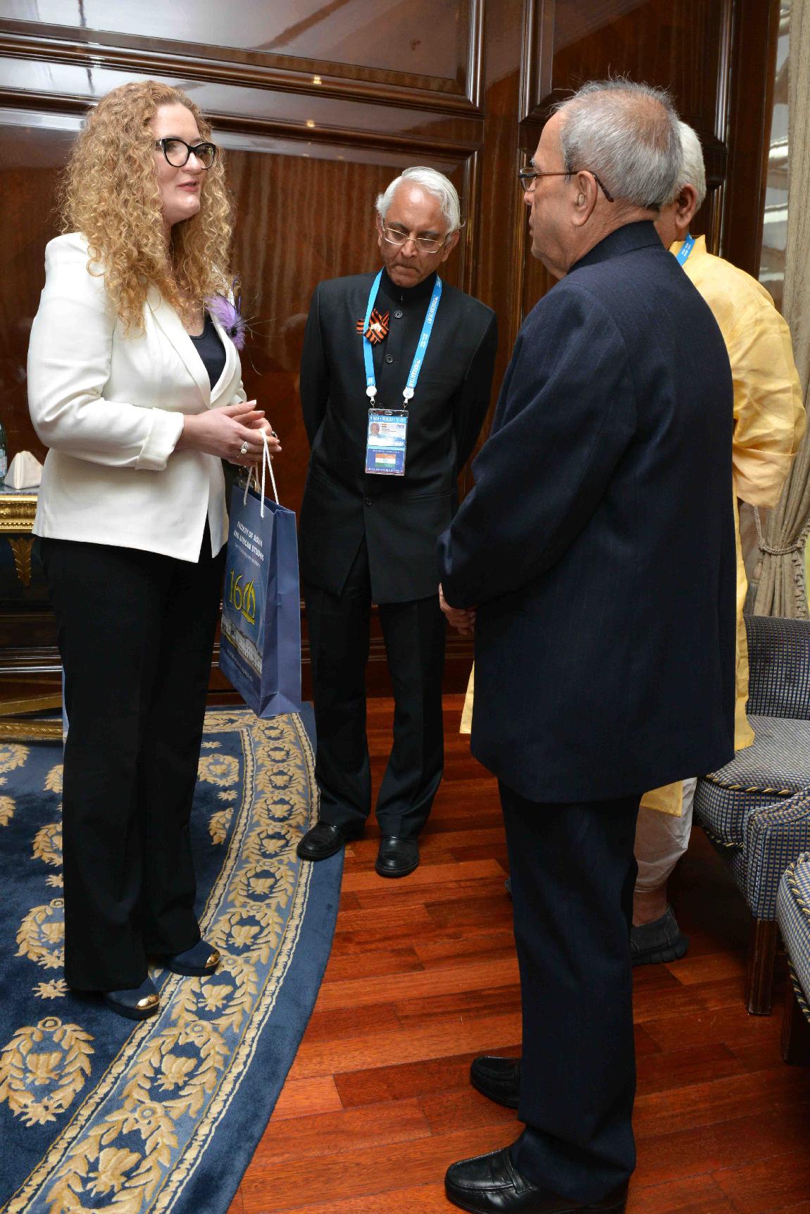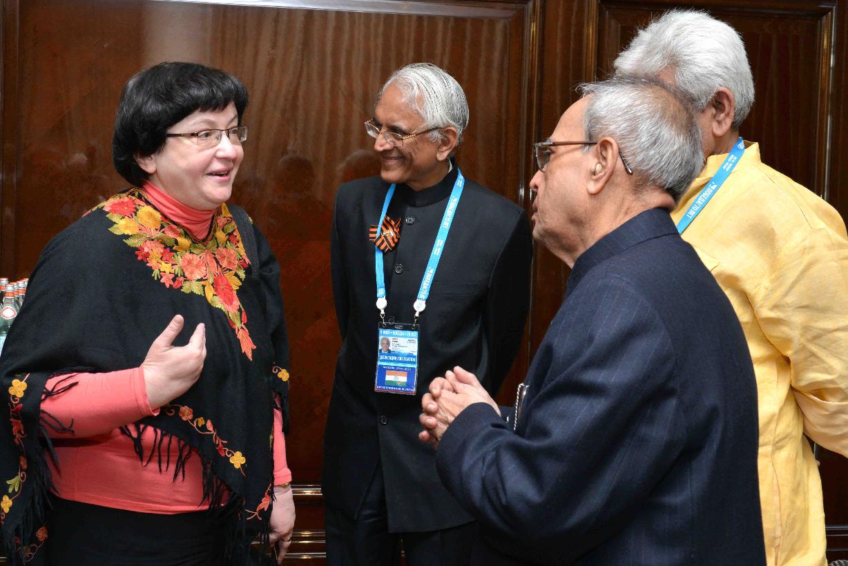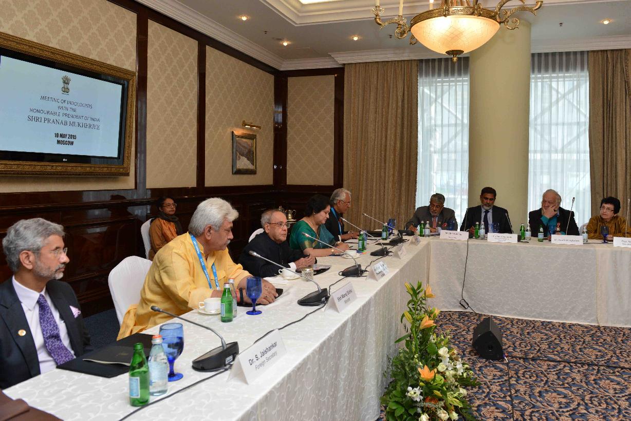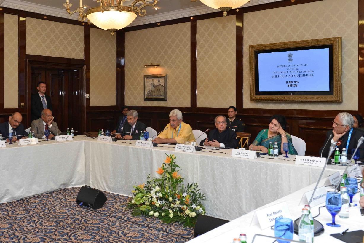 | Caption: | The President of India, Shri Pranab Mukherjee interacting with the prominent Indologists, at Hotel Ritz-Carlton, in Moscow, Russia on May 10, 2015. |
