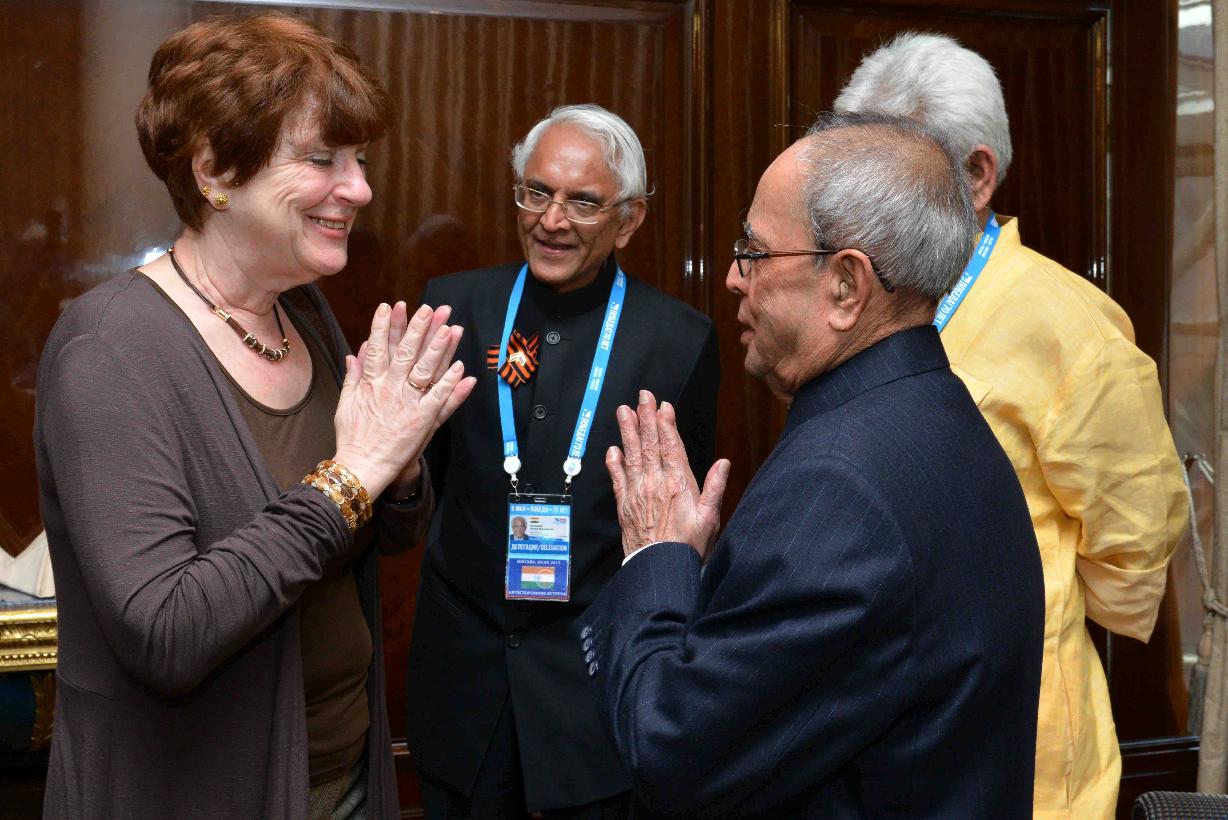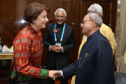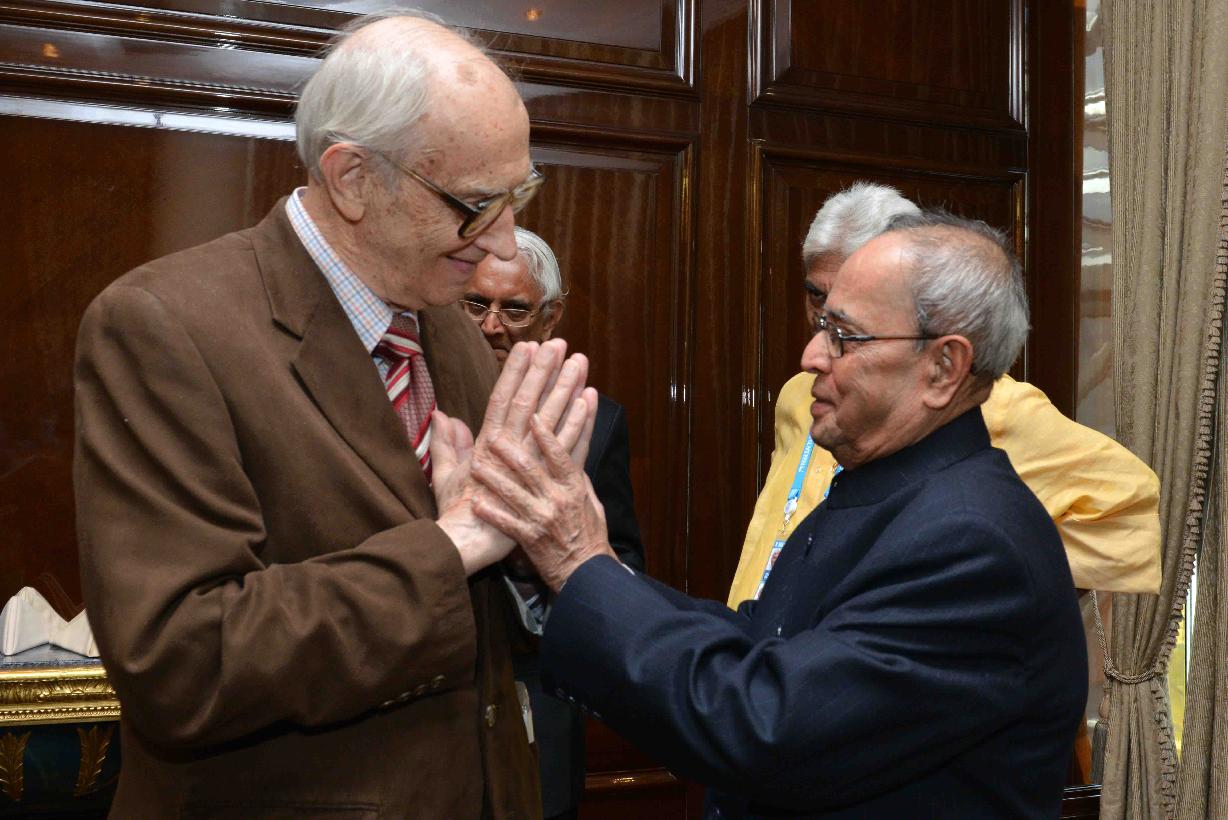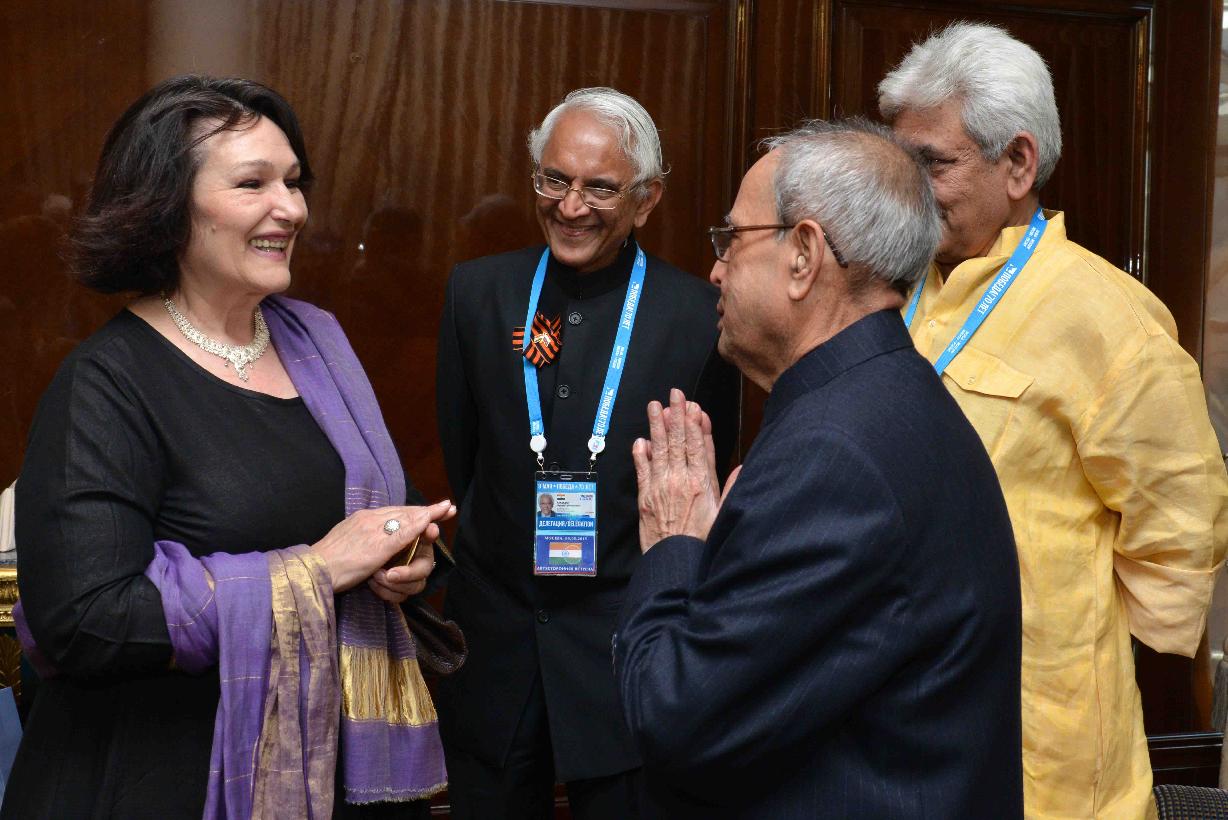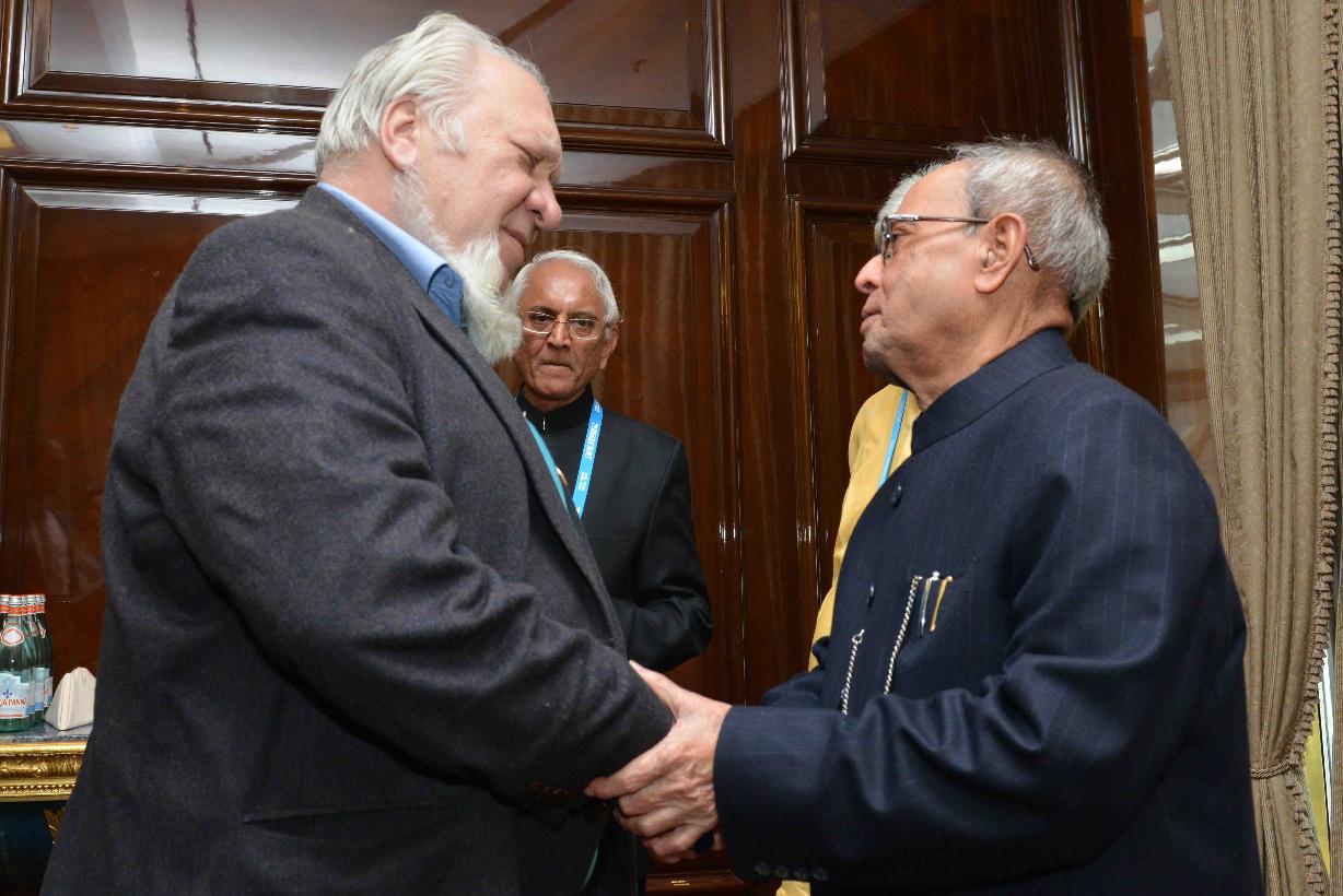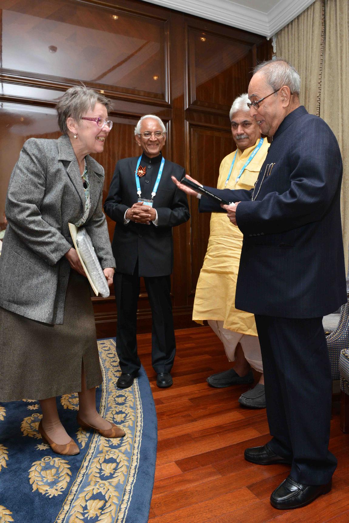 | Caption: | The President of India, Shri Pranab Mukherjee interacting with the prominent Indologists, at Hotel Ritz-Carlton, in Moscow, Russia on May 10, 2015. |