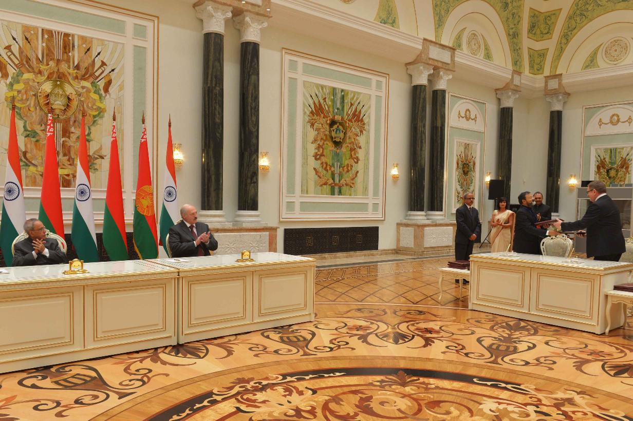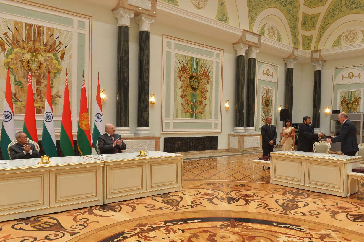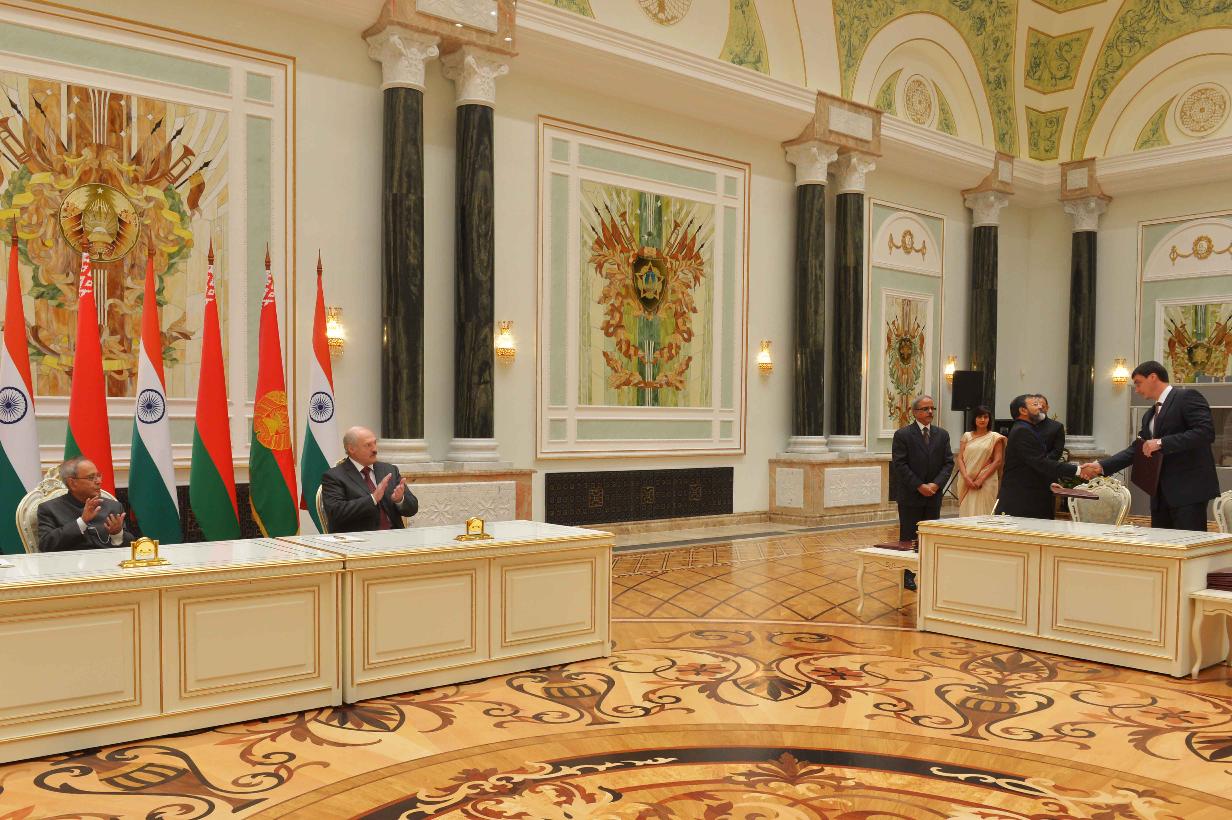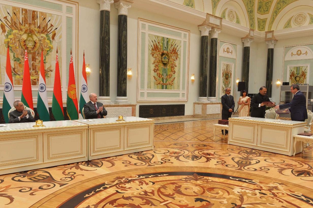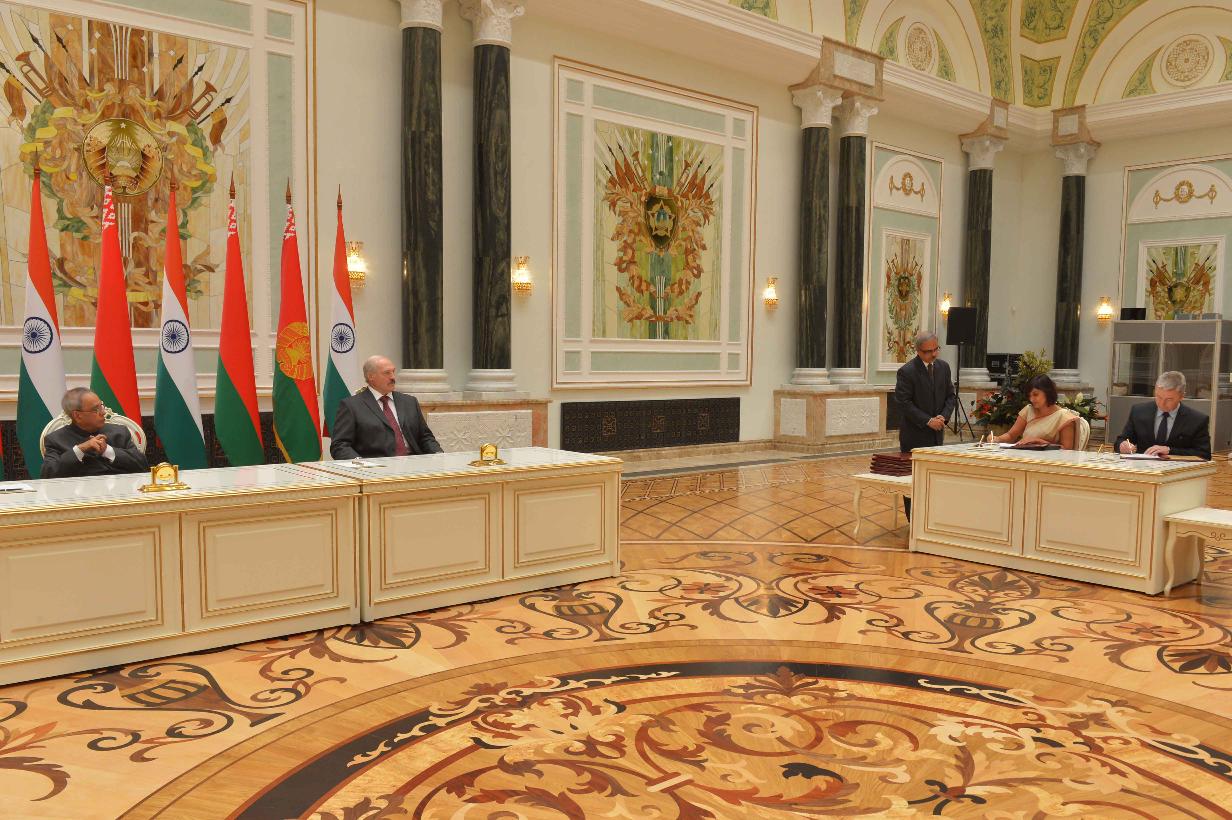 | Caption: | The President of India, Shri Pranab Mukherjee and the President of the Republic of Belarus, Mr. Alexander Lukashenko witnessing the signing of MoUs, at Minsk, in Belarus on June 03, 2015. |