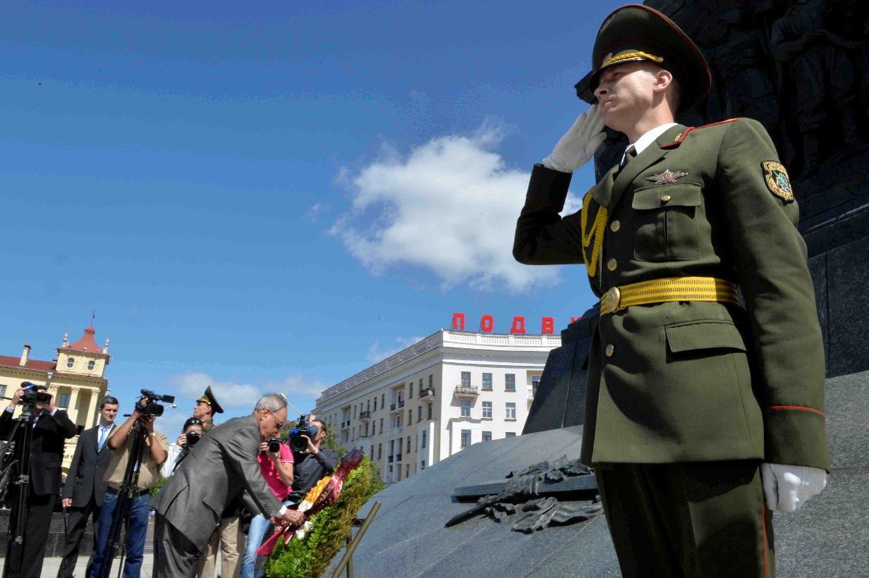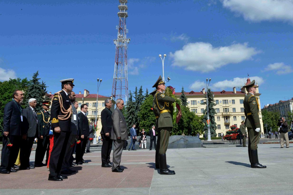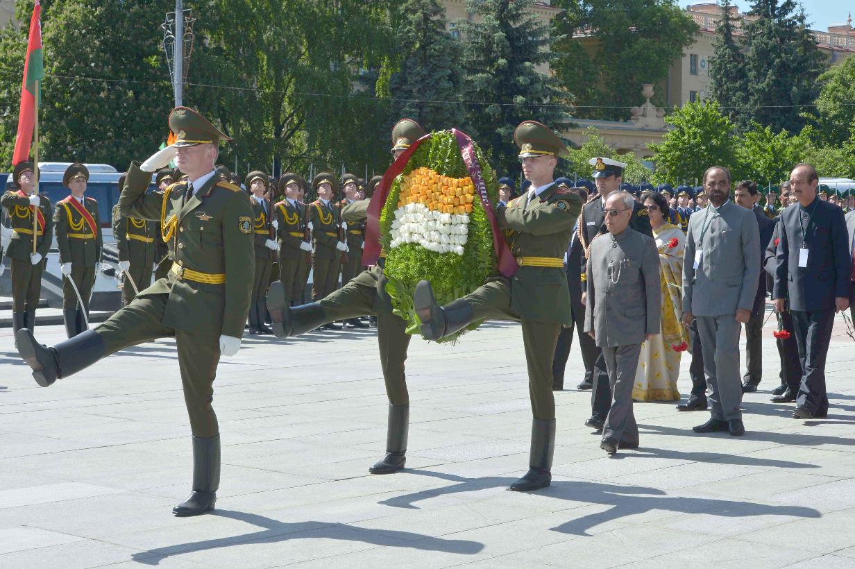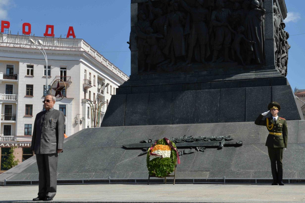 | Caption: | The President of India, Shri Pranab Mukherjee laying wreath at the Victory Monument, Victory Square, at Minsk, in Belarus on June 04, 2015. |