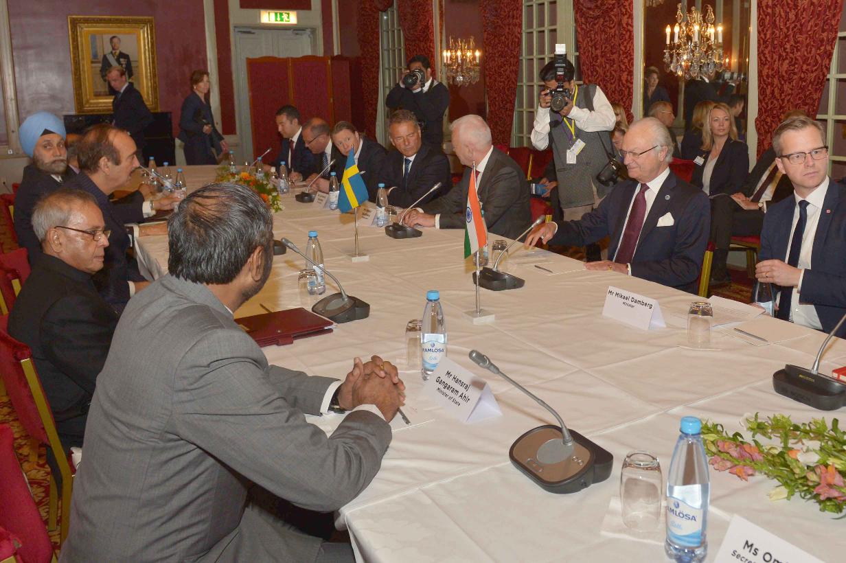 | Caption: | The President, Shri Pranab Mukherjee and the H.M. King Carl XVI Gustf at the Round Table meeting, at Karolinska Institute, in Stockholm, Sweden on June 02, 2015. |